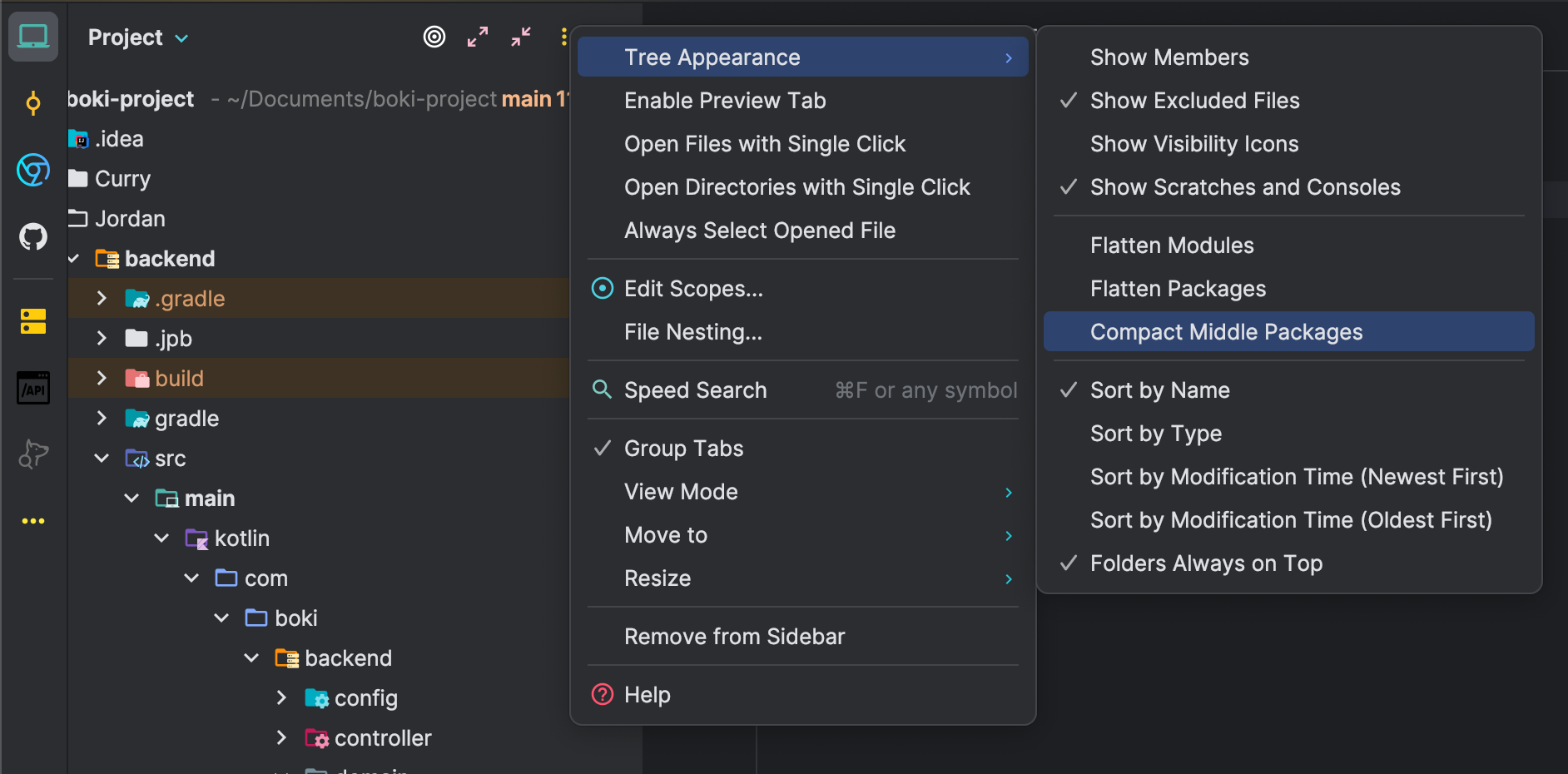 프로젝트에서 3dot 메뉴 클릭 -> Tree Apperance -> Compact Middle Packages 해제