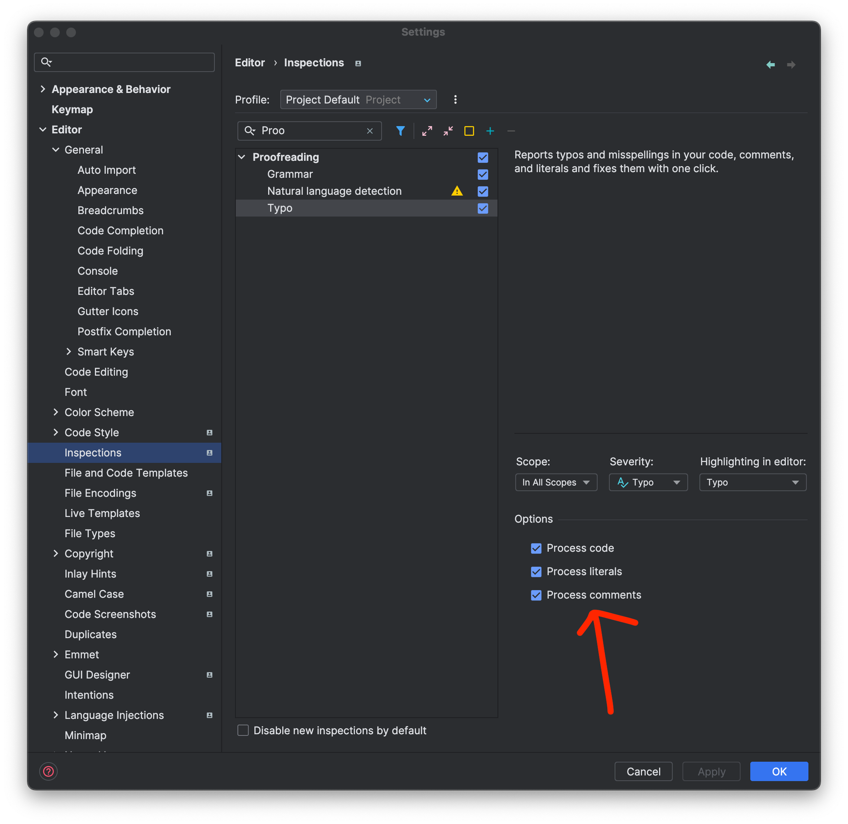 마지막의 Typo에서 옵션의 Process comments를 해제