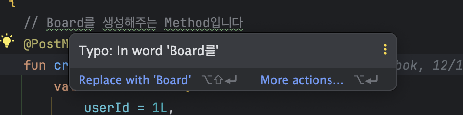 아래와같이 한글 또는 영어+한글이 붙어있는 주석을 작성할때면 눈에 거슬리게 아래 줄로 표시가 된다