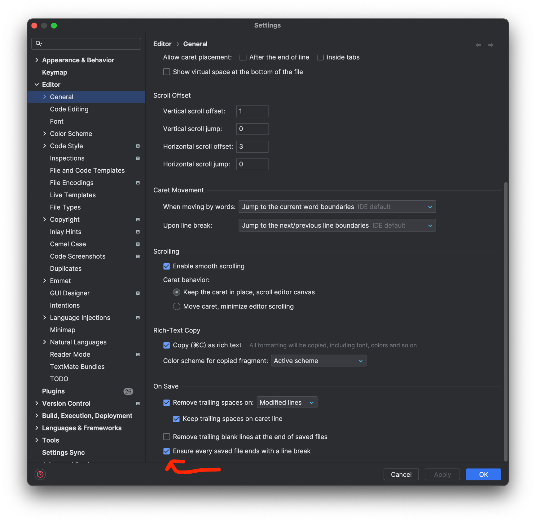 Ensure every saved file ends with a line break 체크