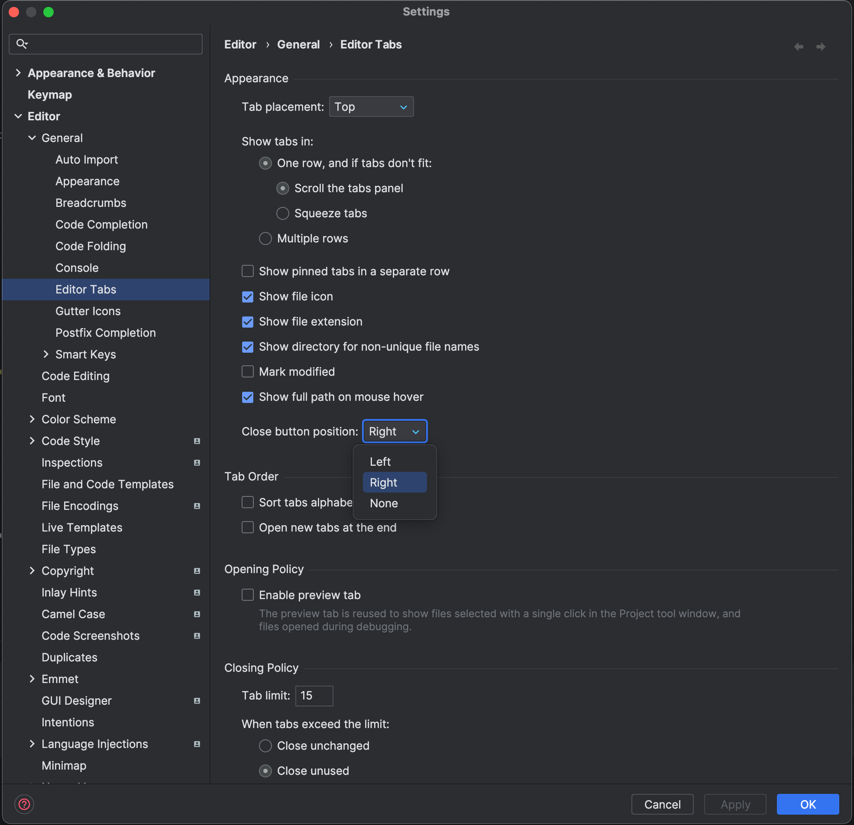 Editor > General > Editor Tabs