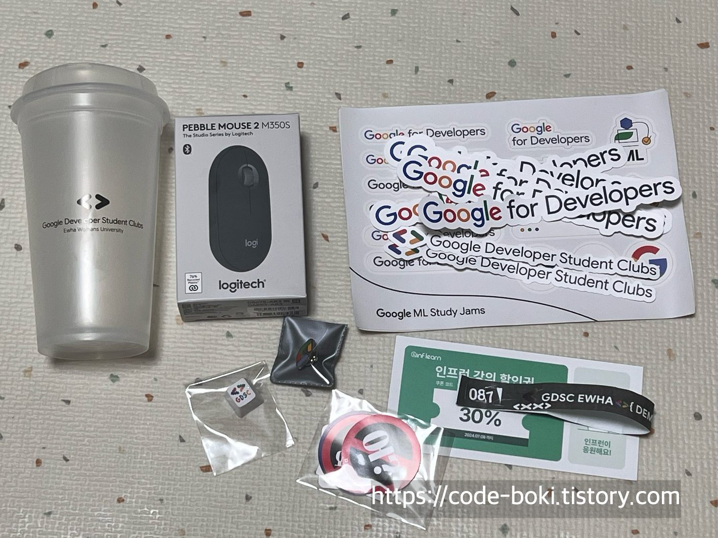 Reusable 텀블러, logitech 마우스, GDSC 키캡, 뱃지, 스티커들, 인프런 30% 할인 쿠폰, 참여팔찌 등을 받았다