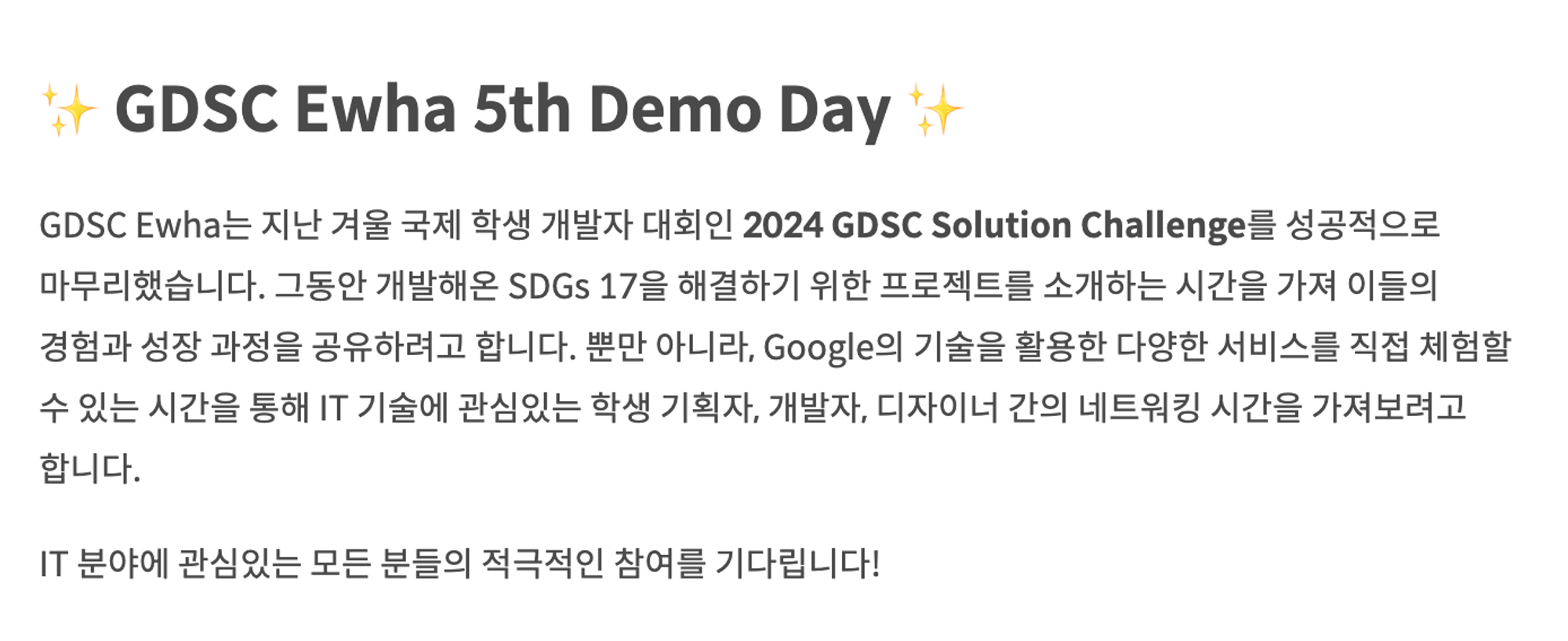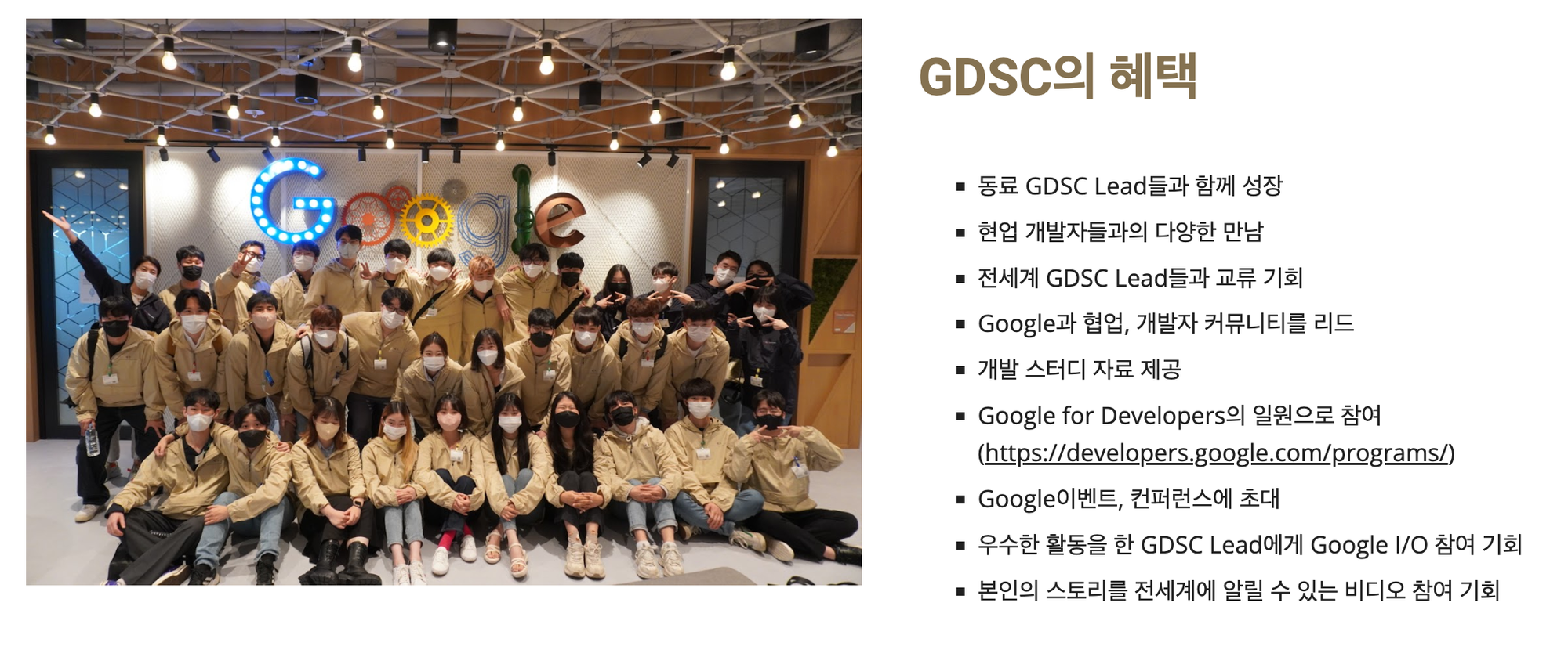- Google Developer Student Clubs (GDSC) 프로그램은 학생들이 개발/리더십 능력을 키울 수 있도록 지원하는 프로그램