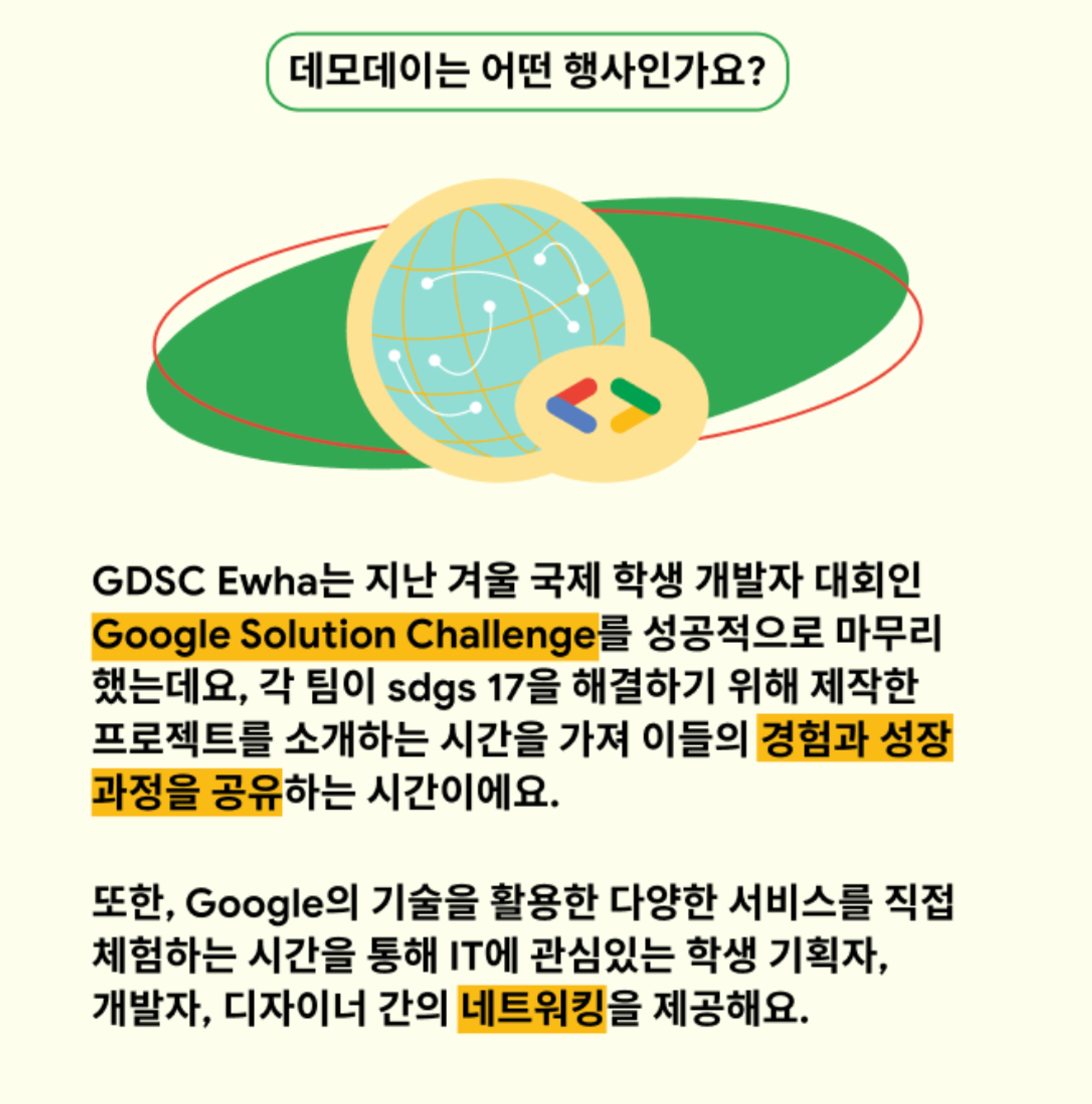 - 학생이 성장할 수 있도록 전세계의 학생 Lead들과의 교류 기회, Google의 이벤트 참여, 현업 엔지니어와의 만남 등 다양한 기회를 제공하고 쇼케이스/워크샵을 통해 역량을 높일 수 있도록 도움