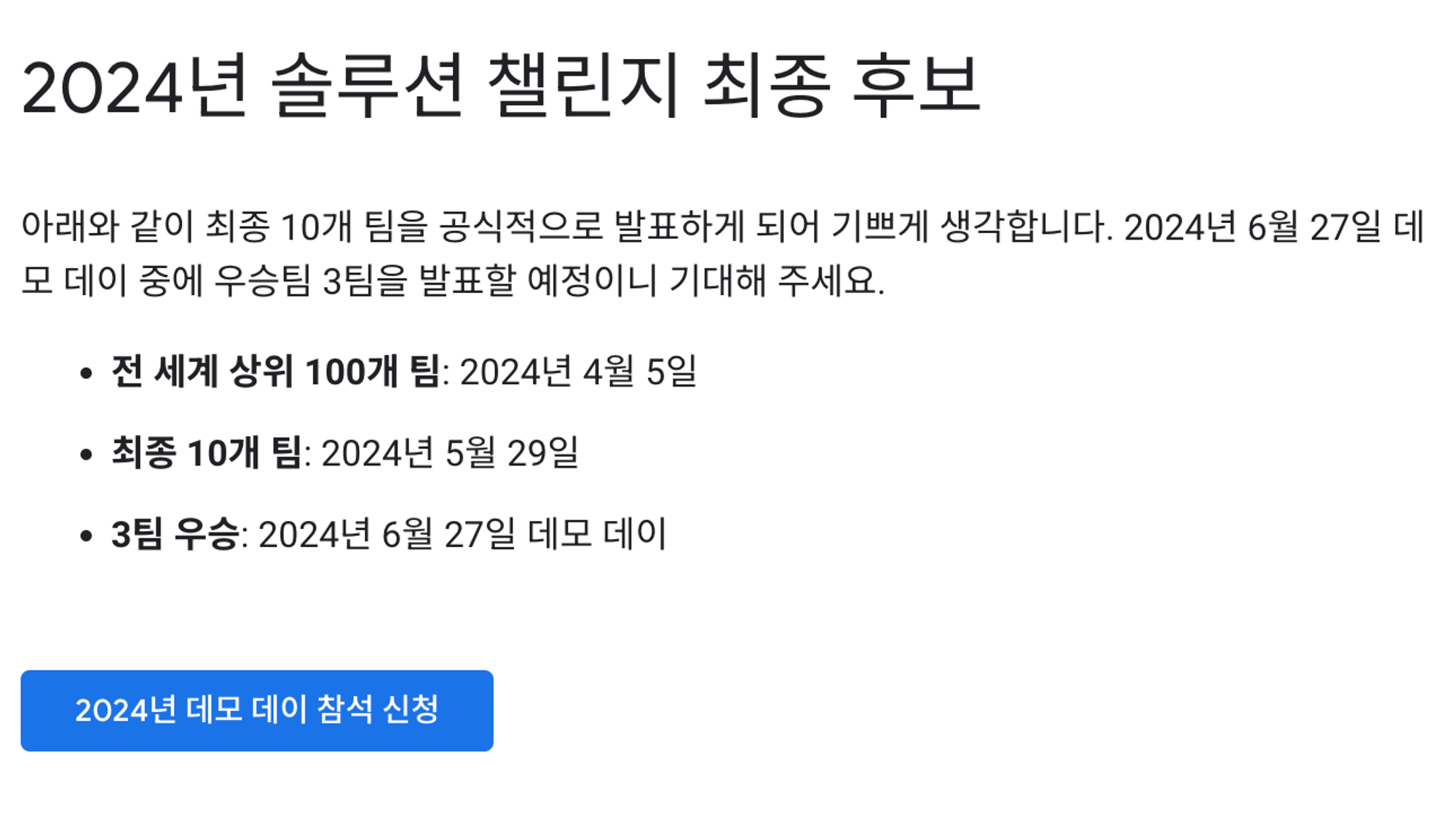 2024년 6월 27일 솔루션 챌린지 데모 데이 동안 최종 10개 팀의 프로젝트를 실시간으로 시청하세요. 자세히 알아보기 이 페이지는 Cloud Translation API를 통해 번역되었습니다. 컬렉션을 사용해 정리하