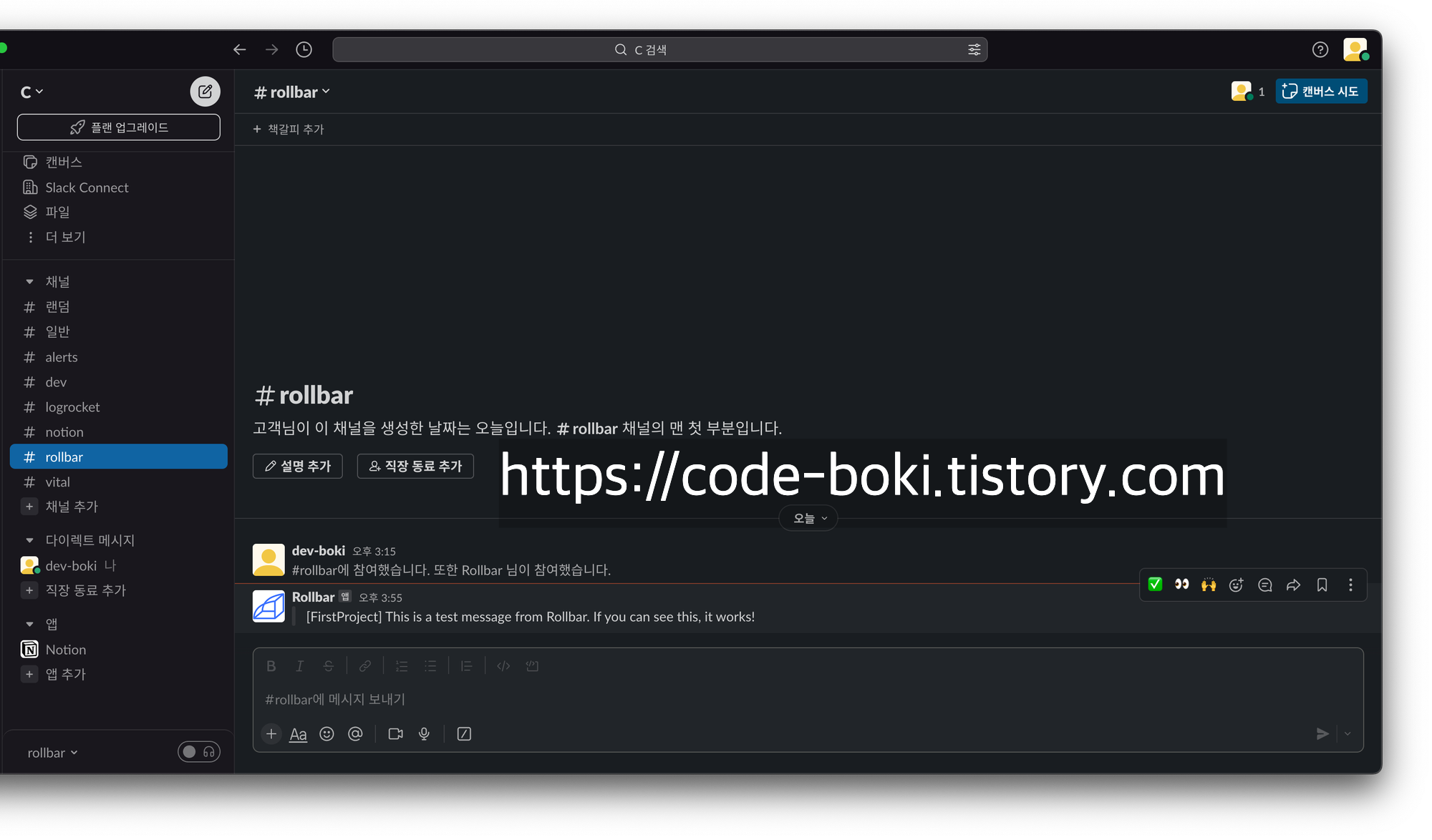 위 사진은 내가 Rollbar를 슬랙에 연동해본 poc..
