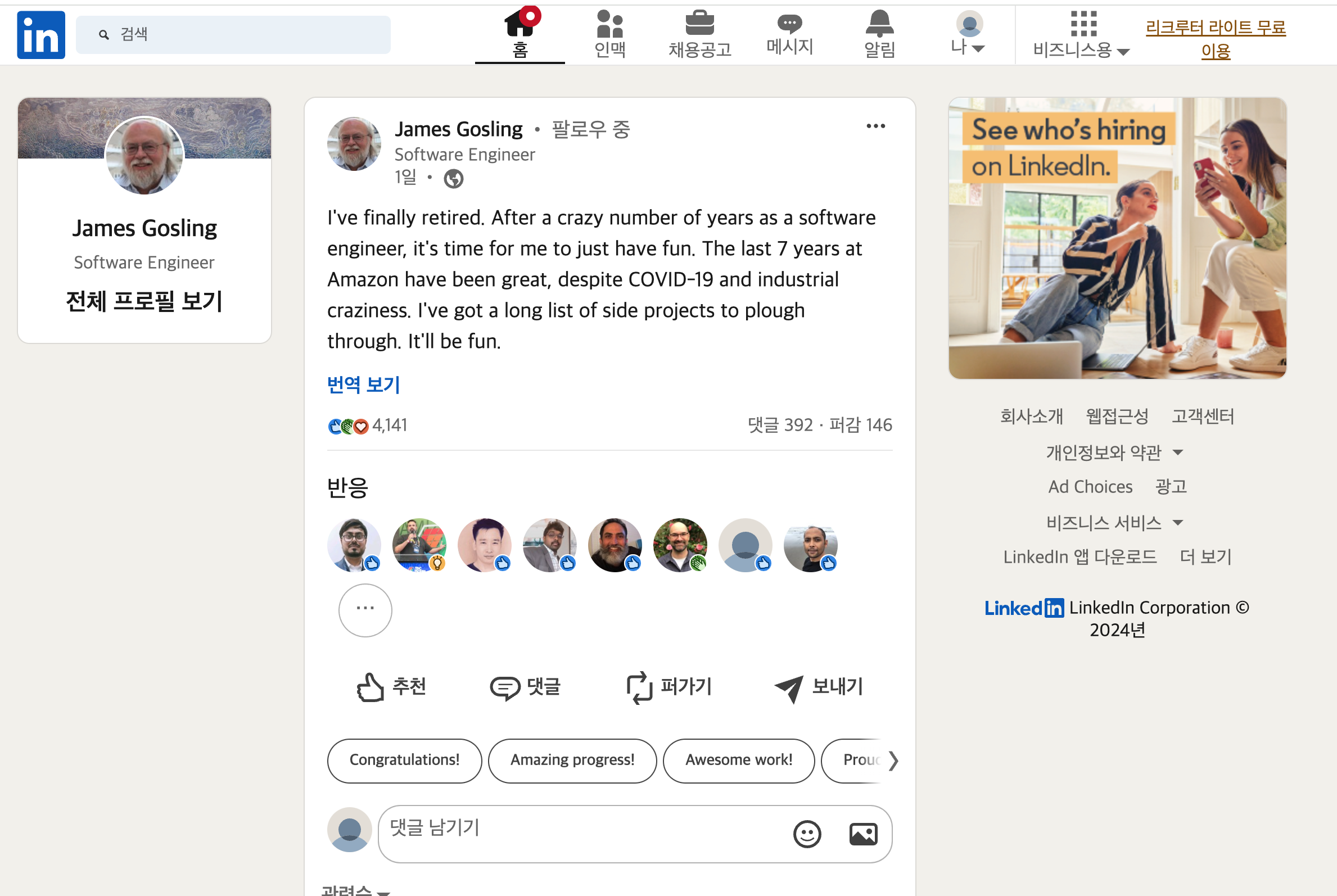 링크드인의 댓글을 보면 다들 그의 은퇴를 축하하고 앞으로의 길을 축복해주는 것 같다.