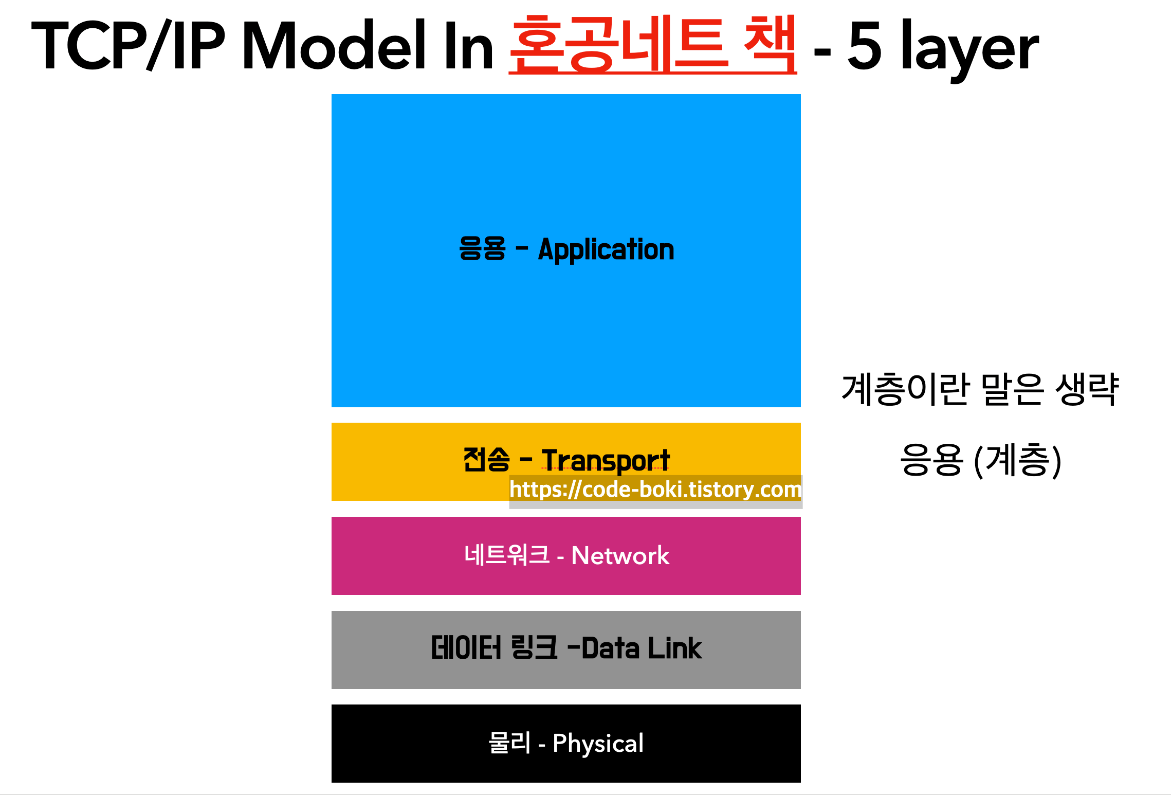 - -> 많은 공식문서와 전공 서적에는 TCP/IP 모델을 5계층으로 확장하여 기술하기도 함(해당 책에서 채택)