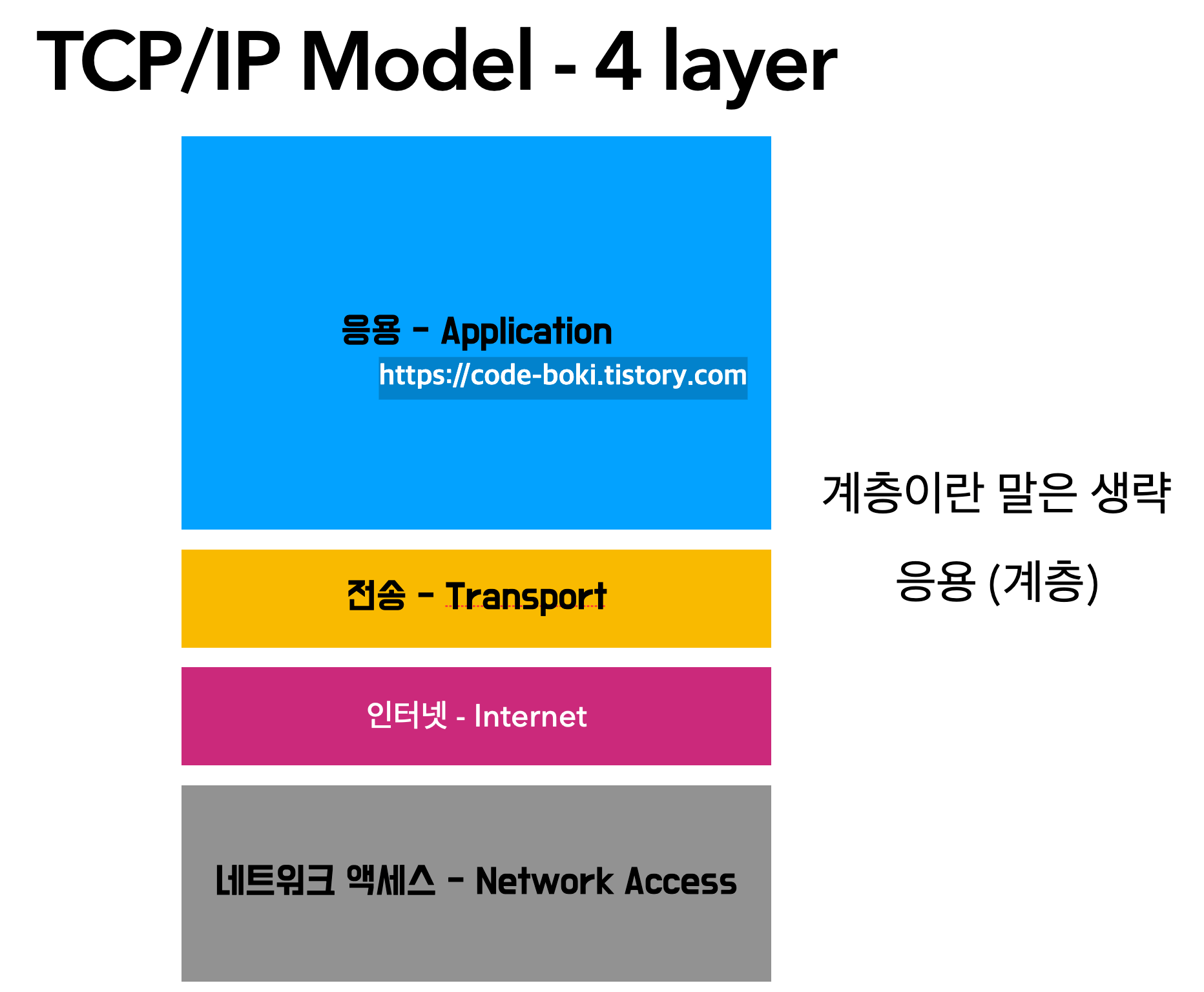 최하위 -> 최상위 계층 순으로 네트워크 액세스 계층 -> 인터넷 계층 -> 전송 계층 -> 응용 계층