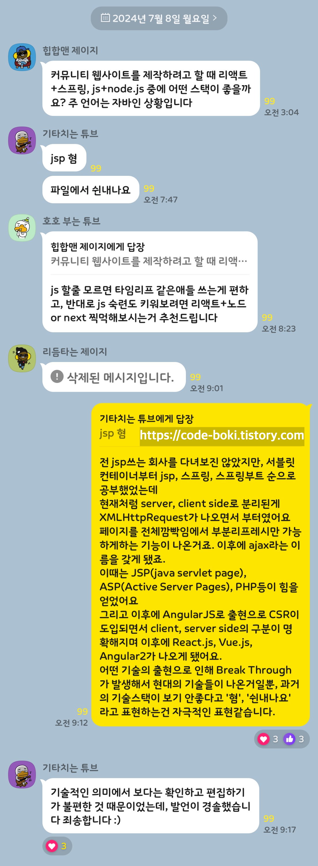 약 800명정도 있는 방에서 아직 대학생이신 분이 앞뒤없이 jsp 혐이라고 하셨기에, 내가 조금 진지한 어투로 특정 기술에 대해서 혐오보다는 왜 현재 기술이 나오게 됐는지 이해했으면 좋겠고 과거의 기술들을 욕할거라면 많은 사람들이 있는 방이기에 soft하게 풀어서 말했으면 좋겠다고 말씀을 드렸다.