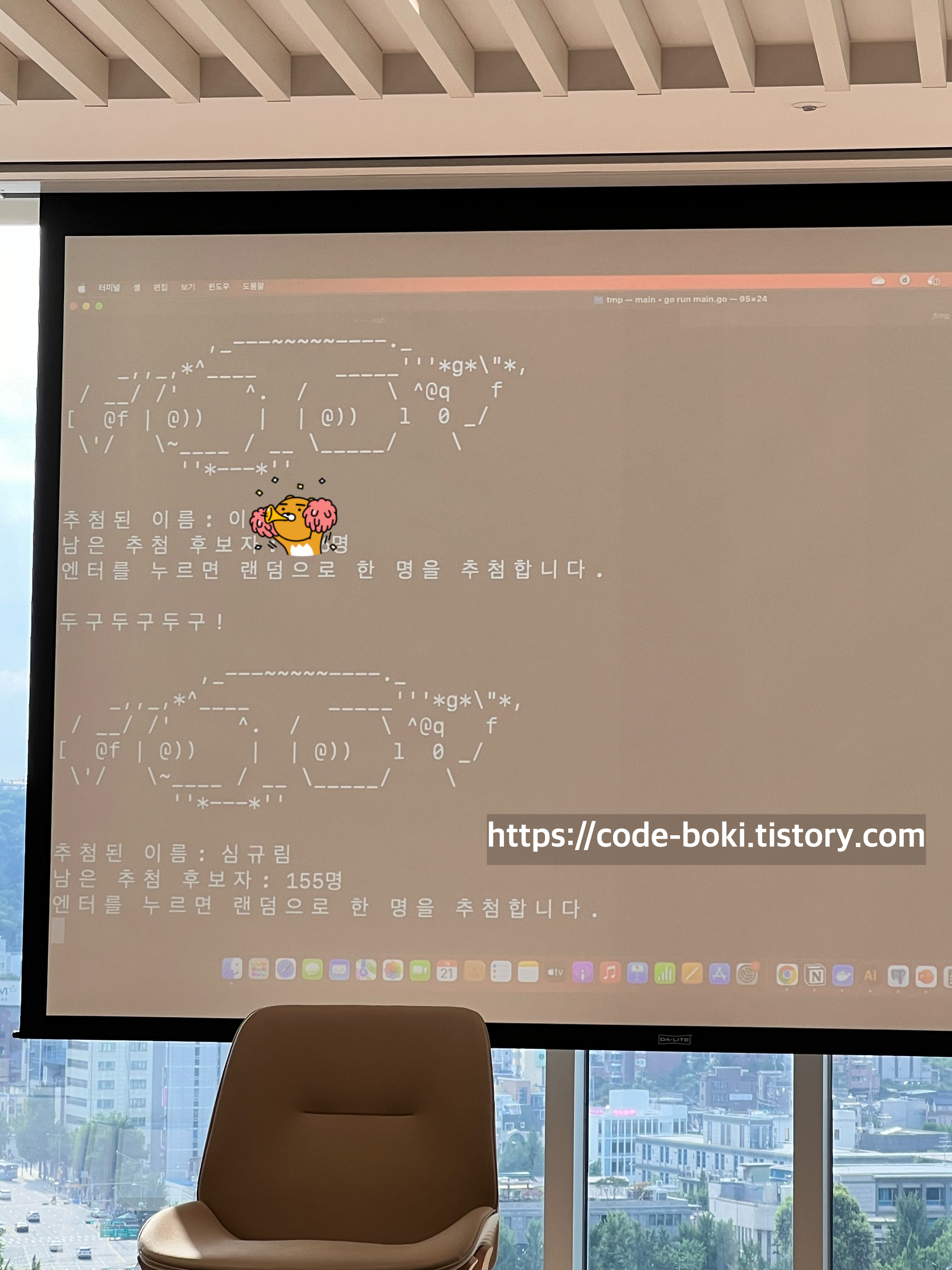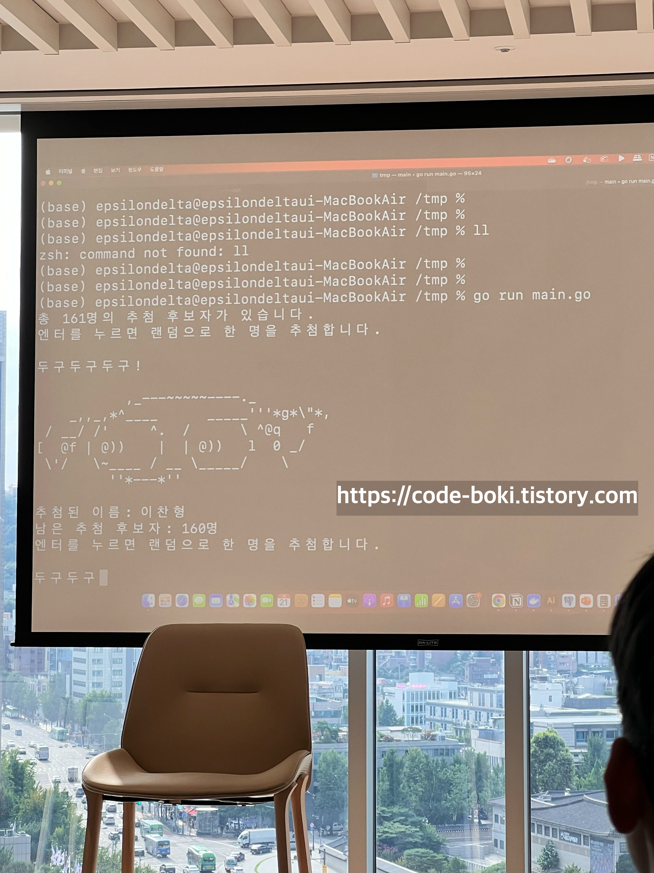 마지막으로 랜덤추첨 2명을 뽑아서 책을 나눠주는 시간이 있었는데... 참가자분들을 하나하나 부르려다가 GDE 한성민님이 나와서 기존에 golang으로 만들어둔 코드가 있다면서 도움을 주셨다