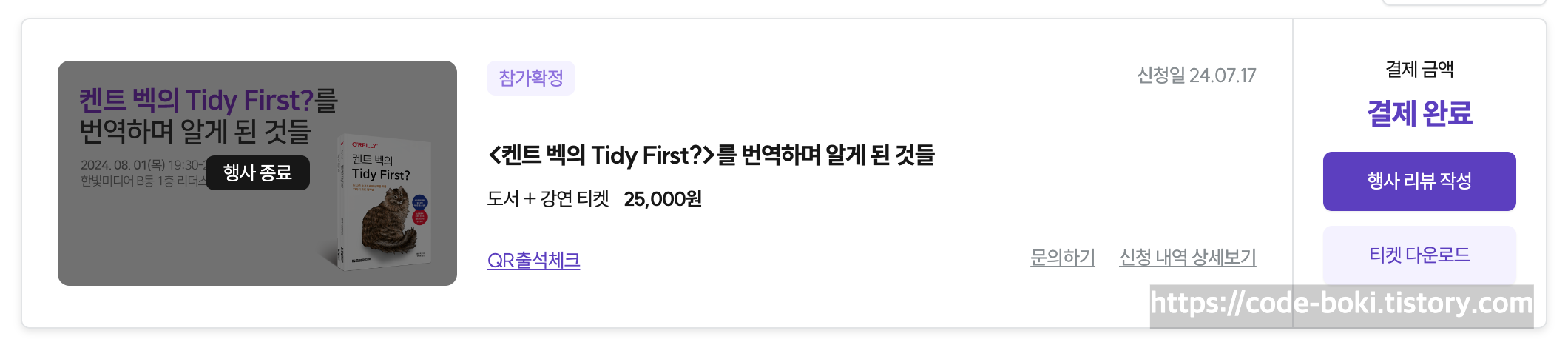 이번에는 이벤터스로 책 구매와 함께 신청했기 때문에 Tidy Fisrt? 책을 새로 받을 수 있었고, 추가로 좋은 질문 대상자에 당첨되서 이 책도 받게 됐다!!