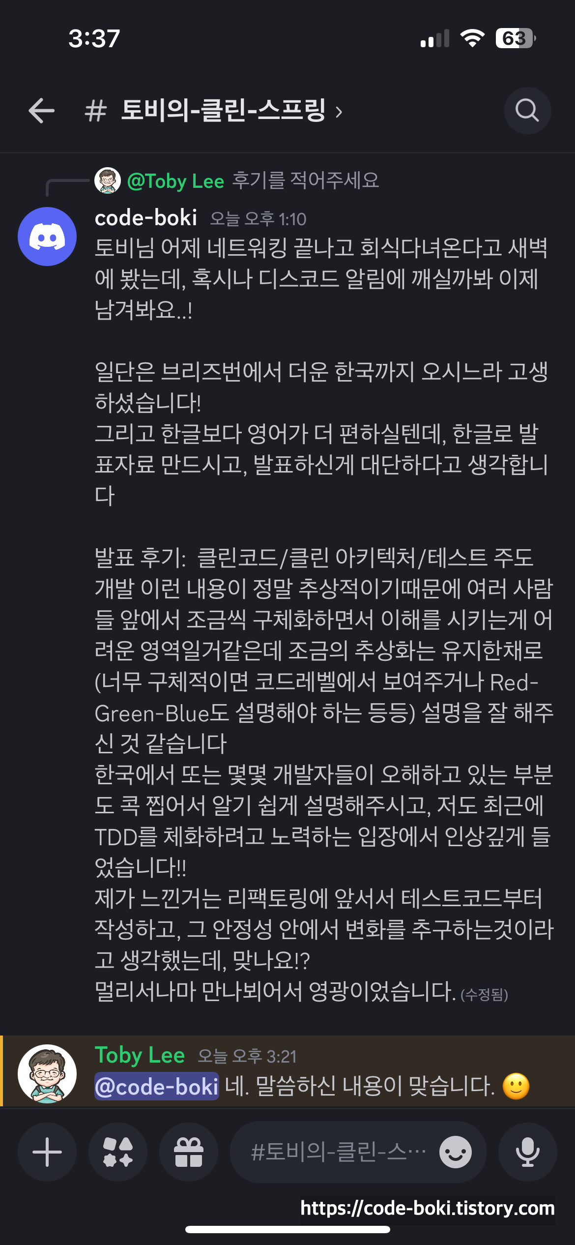 > 토비님에게 남긴 내 후기