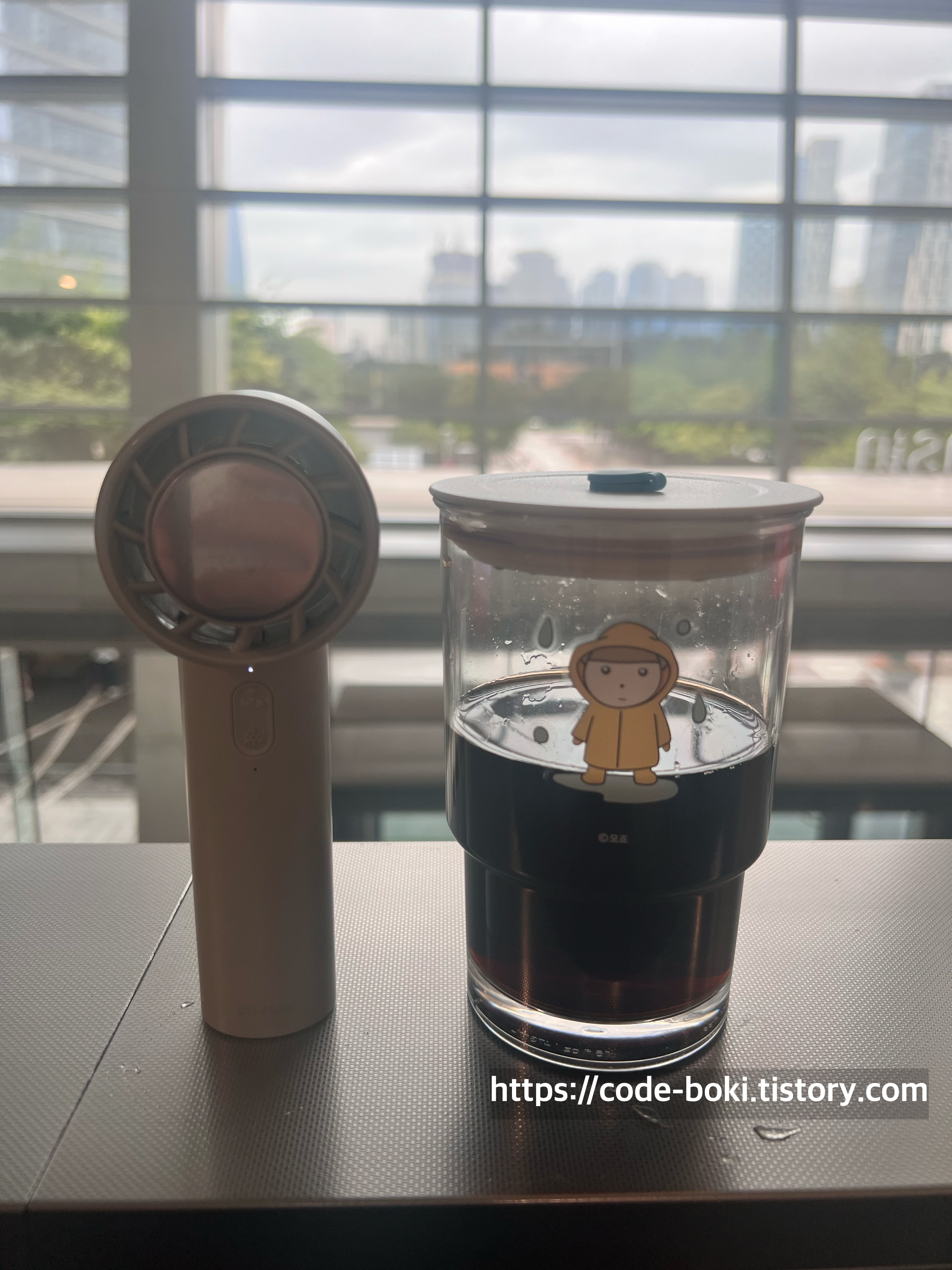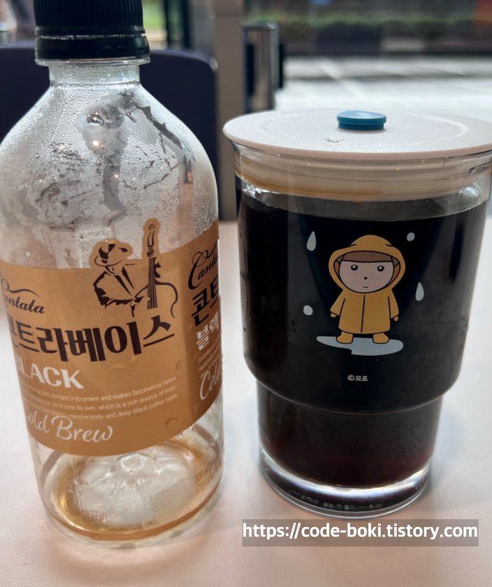 커피를 들고 돌아다니는 게 안되는 것 같아서 집에서 가져온 커피와 텀블러. 마루 텀블러에 커피를 가득 담아줬다