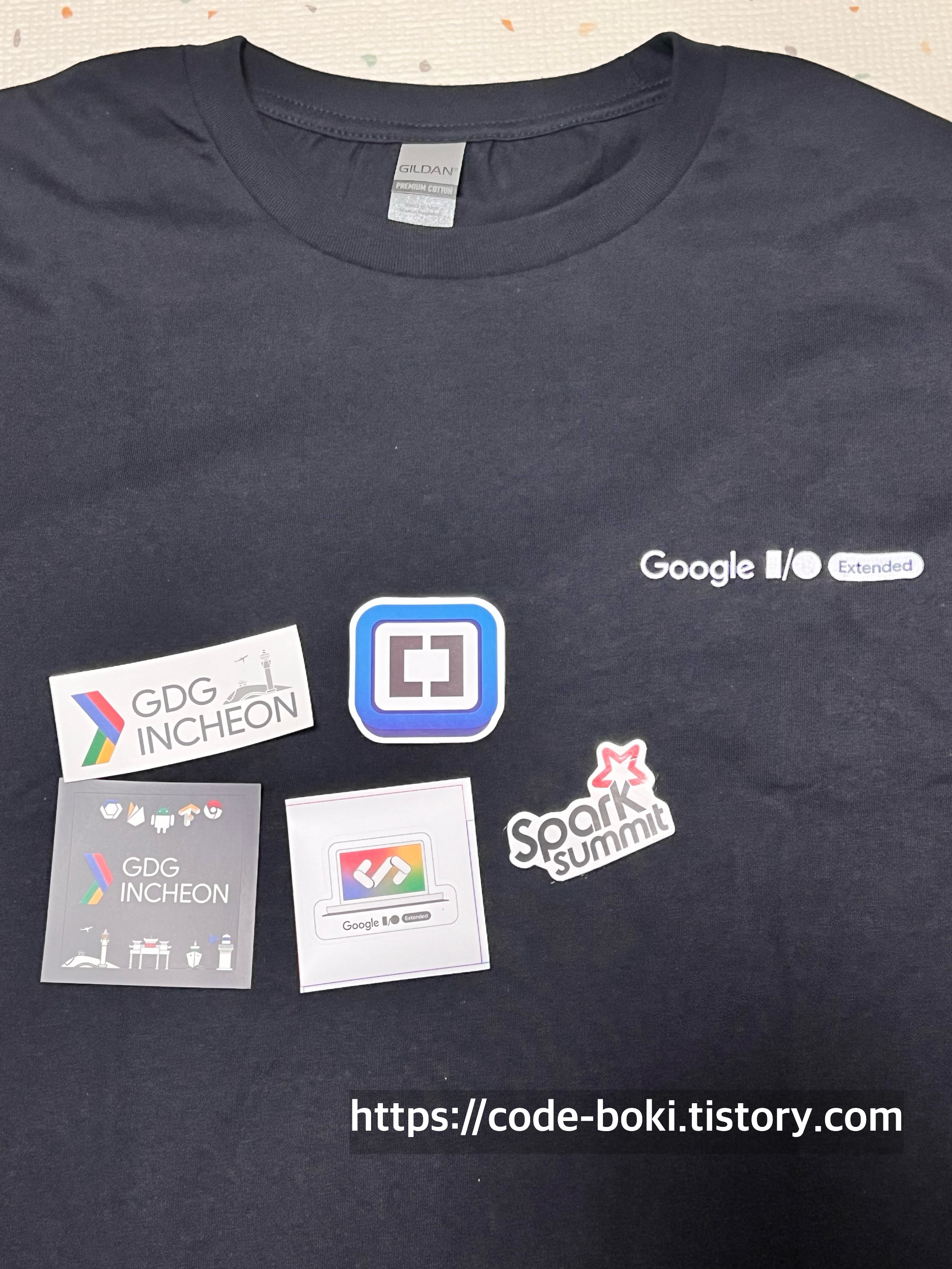 입장하면서 Google I/O Extended 티셔츠와 각종 스티커를 가져갈 수 있었다