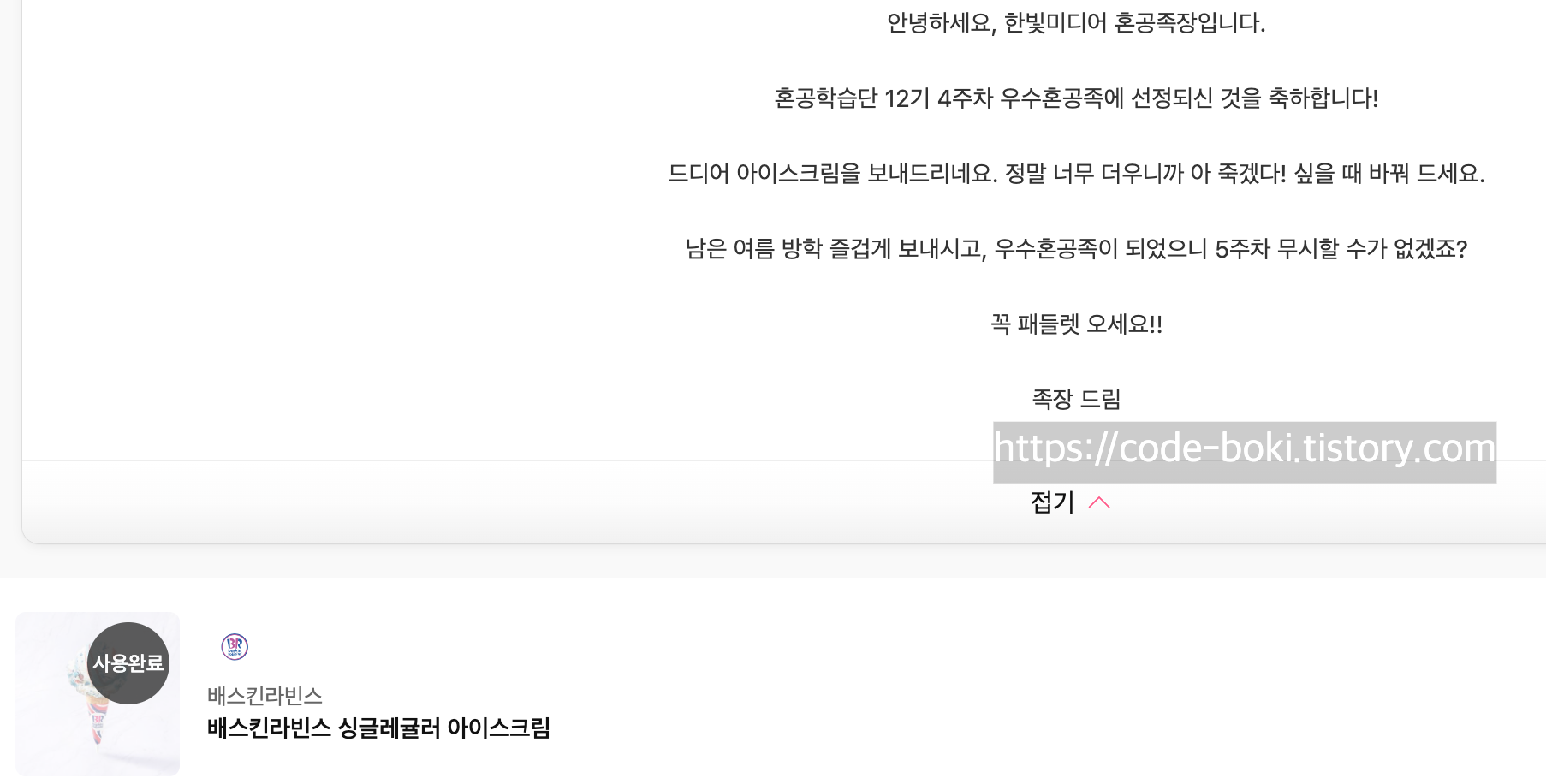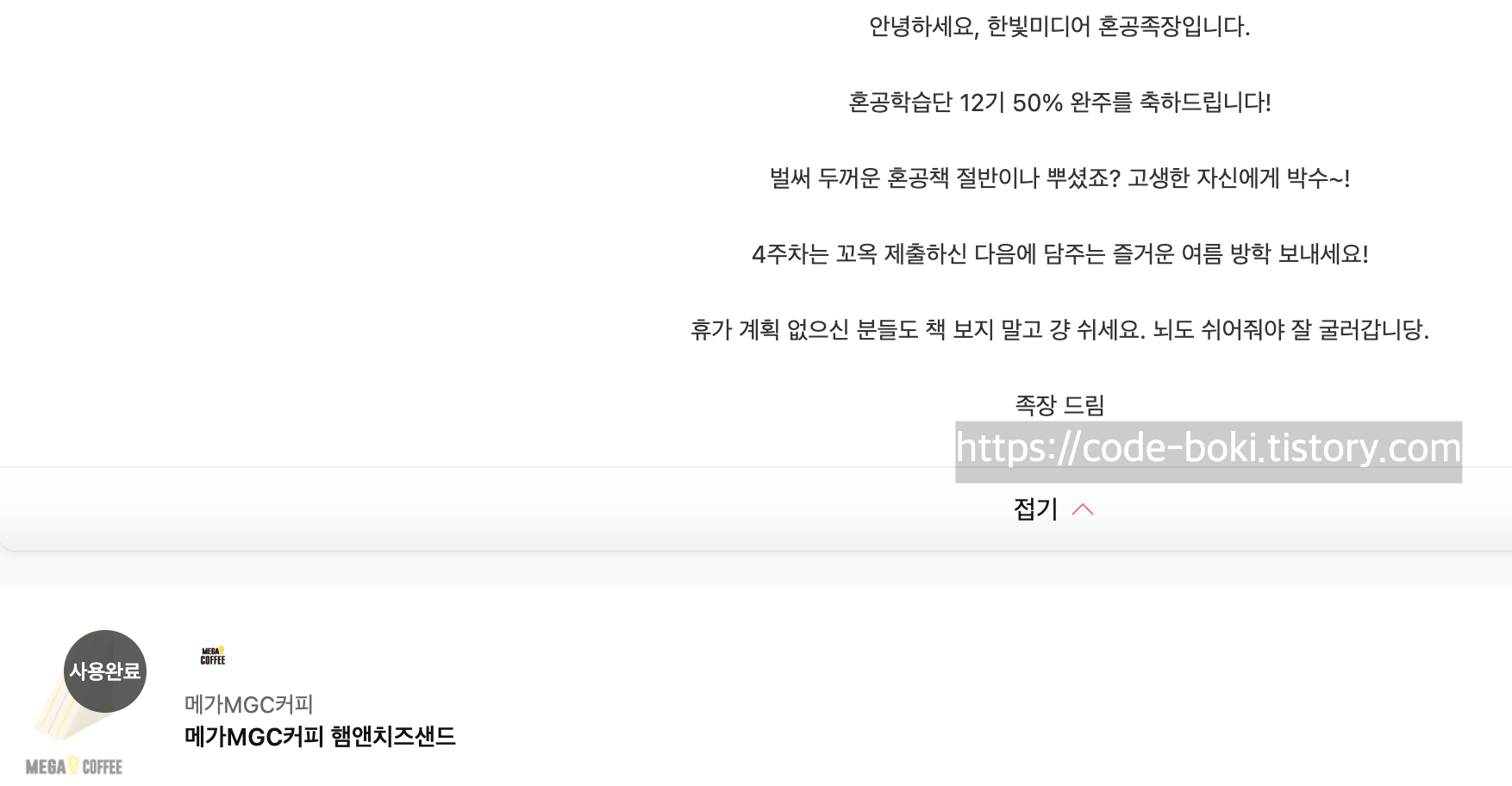 저번주 우수 혼공족으로 선정돼서 베스킨라빈스 쿠폰으로 베라 아이스크림도 먹고, 50% 완주한 기념으로 받은 메가커피 햄앤치즈샌드도 있었는데 이건 전국 매장에서 햄앤치즈가 지금 생산이 안된다고 해서 다른 메뉴(할메가커피)로 바꿔먹었다!