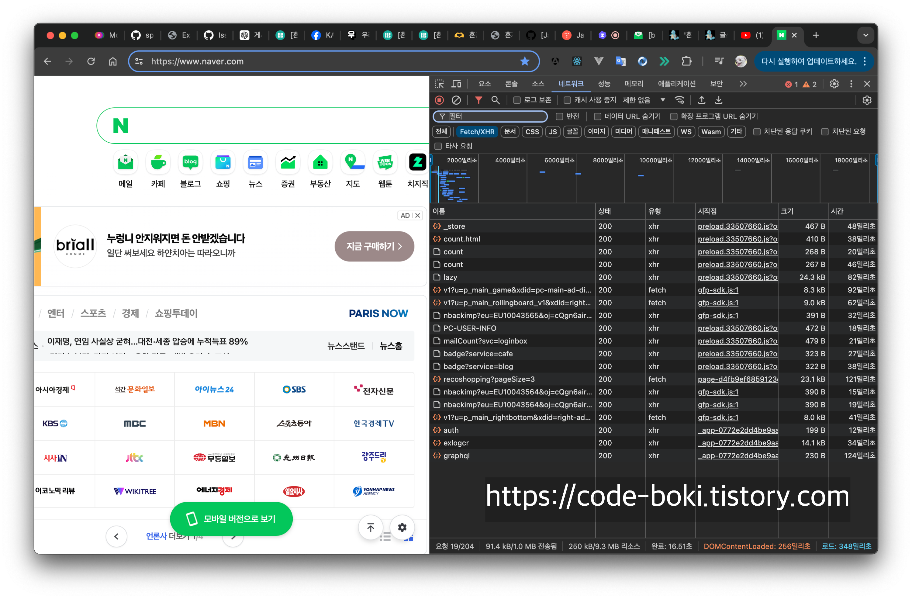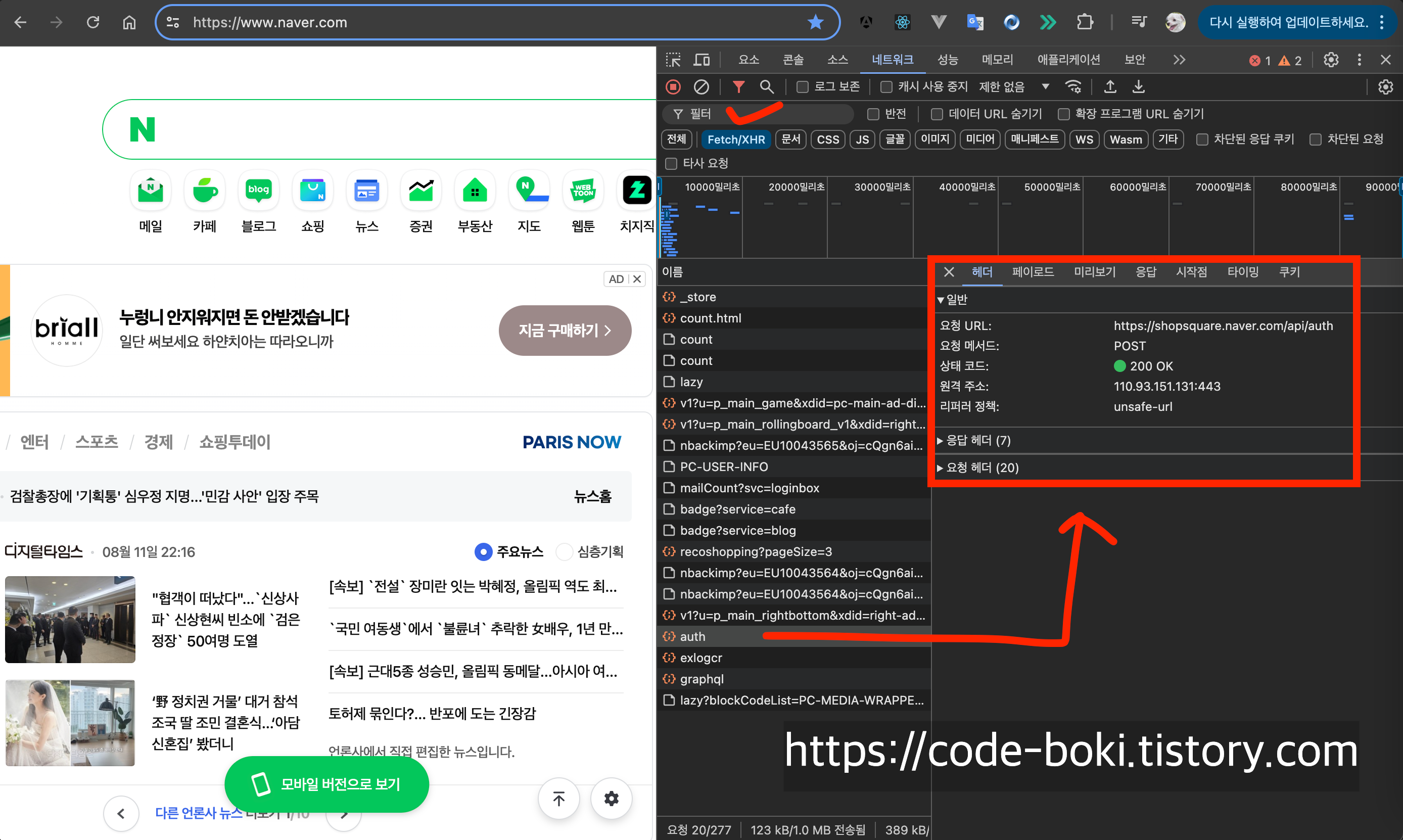 네이버로 들어가서 개발자 도구를 확인해봤다