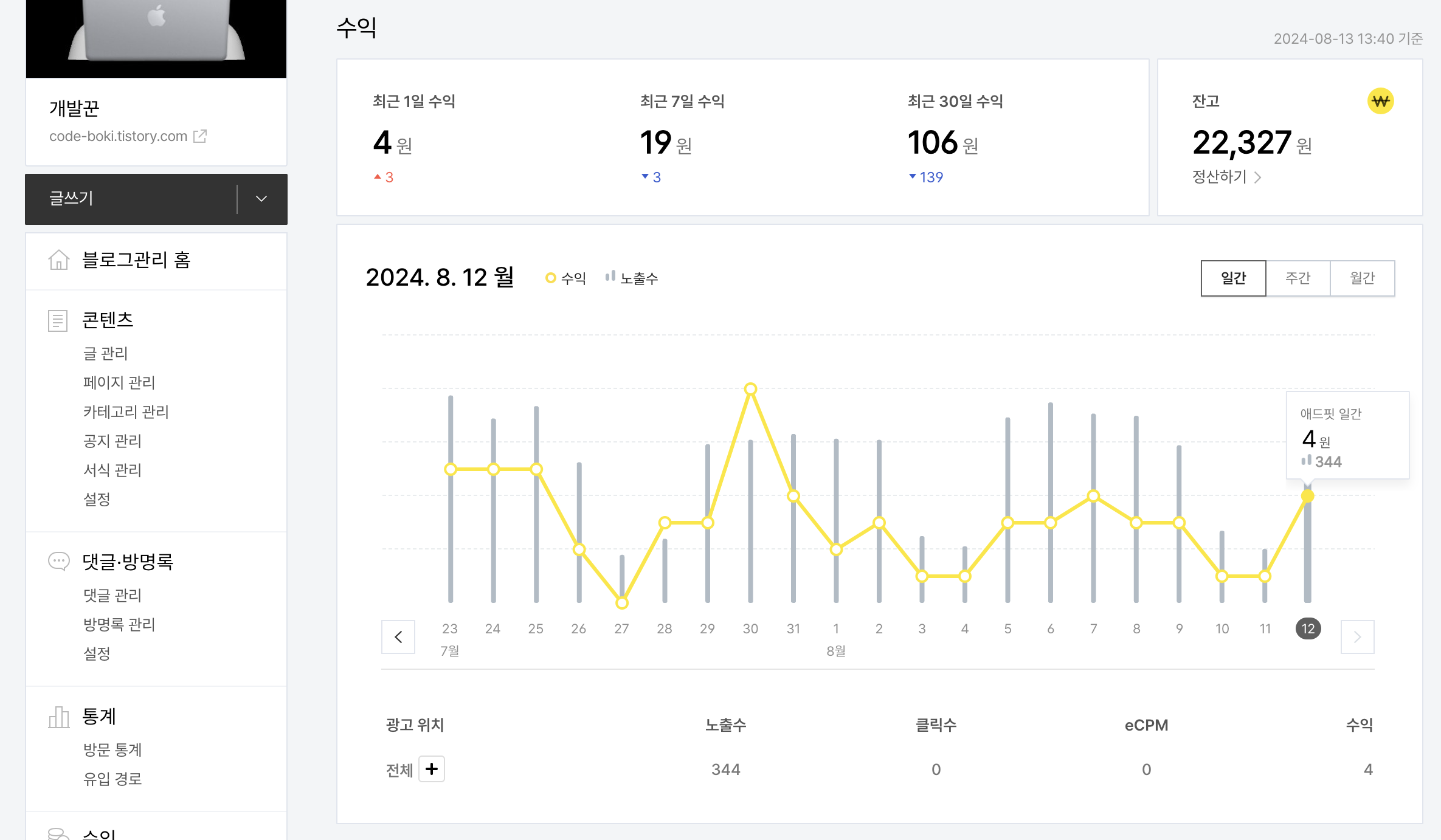 그리고 현재 티스토리로는 크게 이익이 나지 않는 것 같다..