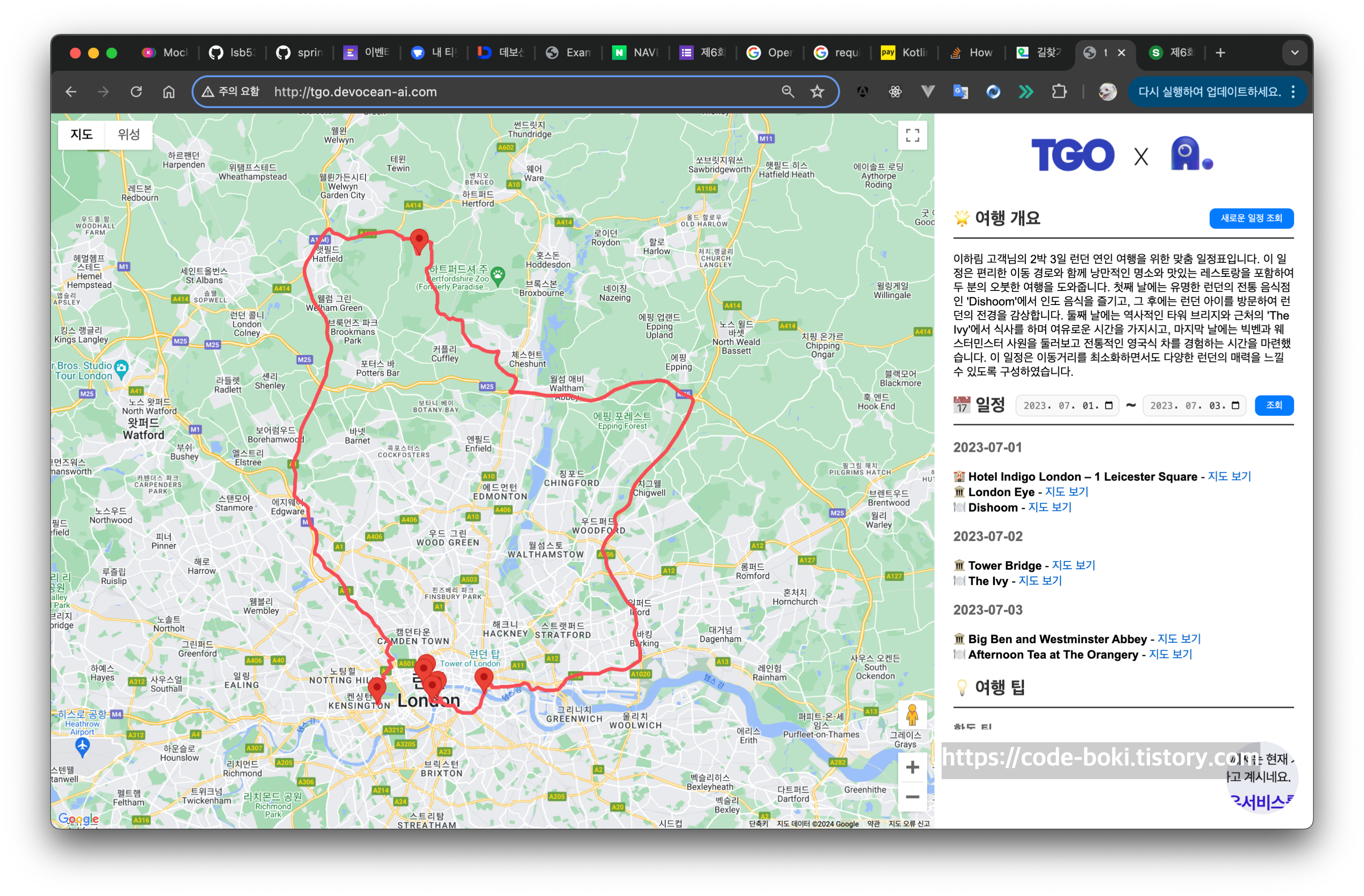 결과물은 상상 이상이었다! 런던에서 하루하루마다 어디 갈지를 작성해주고, 결과물을 지도로도 보여줘서 정말 만족스러웠다