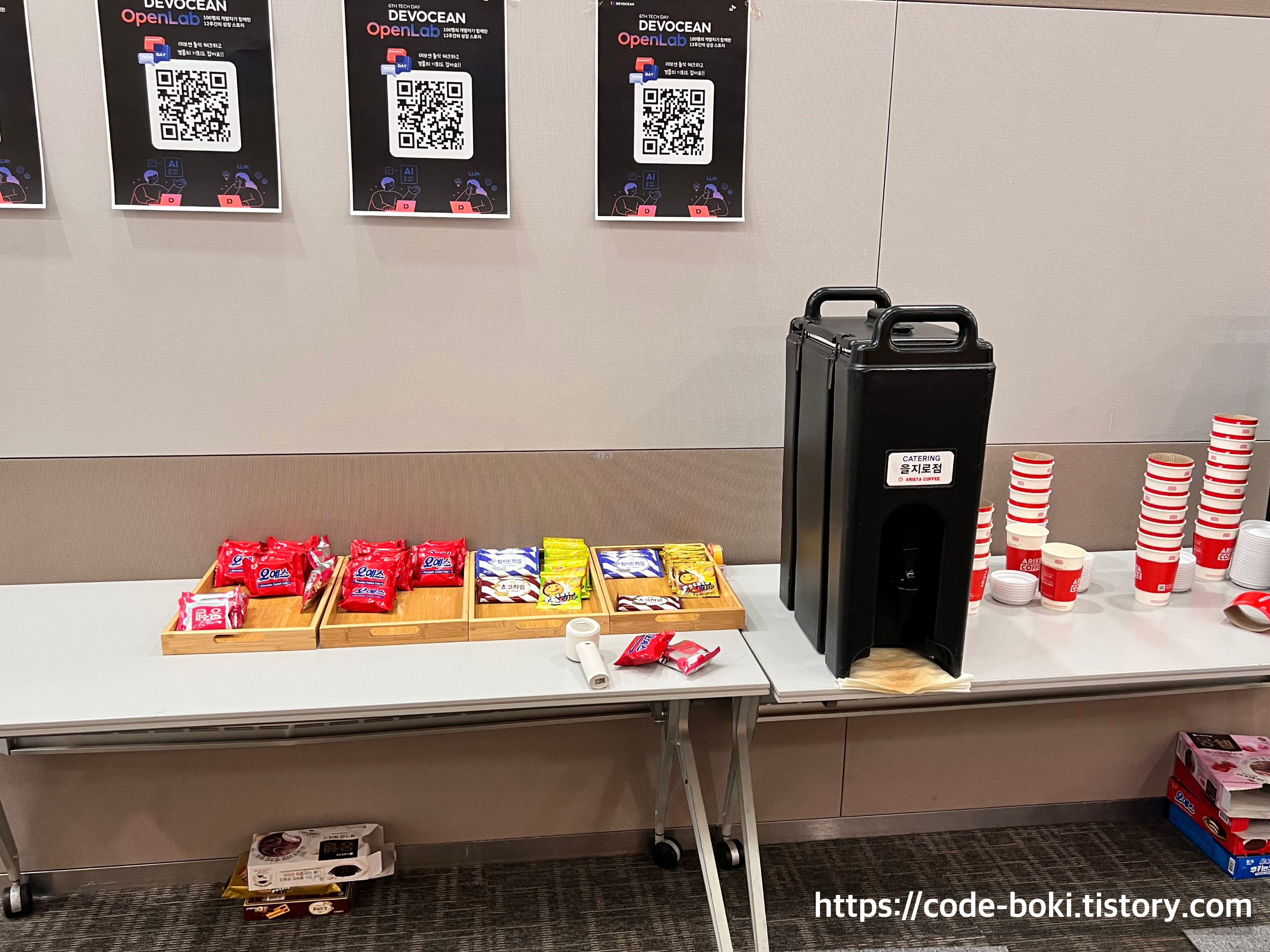 입구에는 간단한 다과들과 냉커피 + 데보션 스티커가 준비되어 있었다