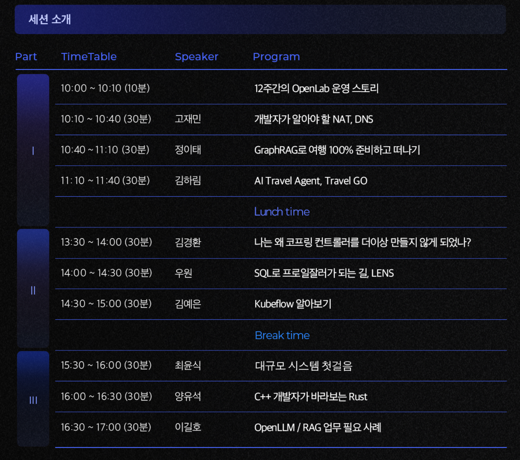 부족할때마다 다른 개발자분이 마이크를 잡긴 했는데, 기술이나 프로젝트는 괜찮았지만 발표 연습은 조금 부족해보이셨다!