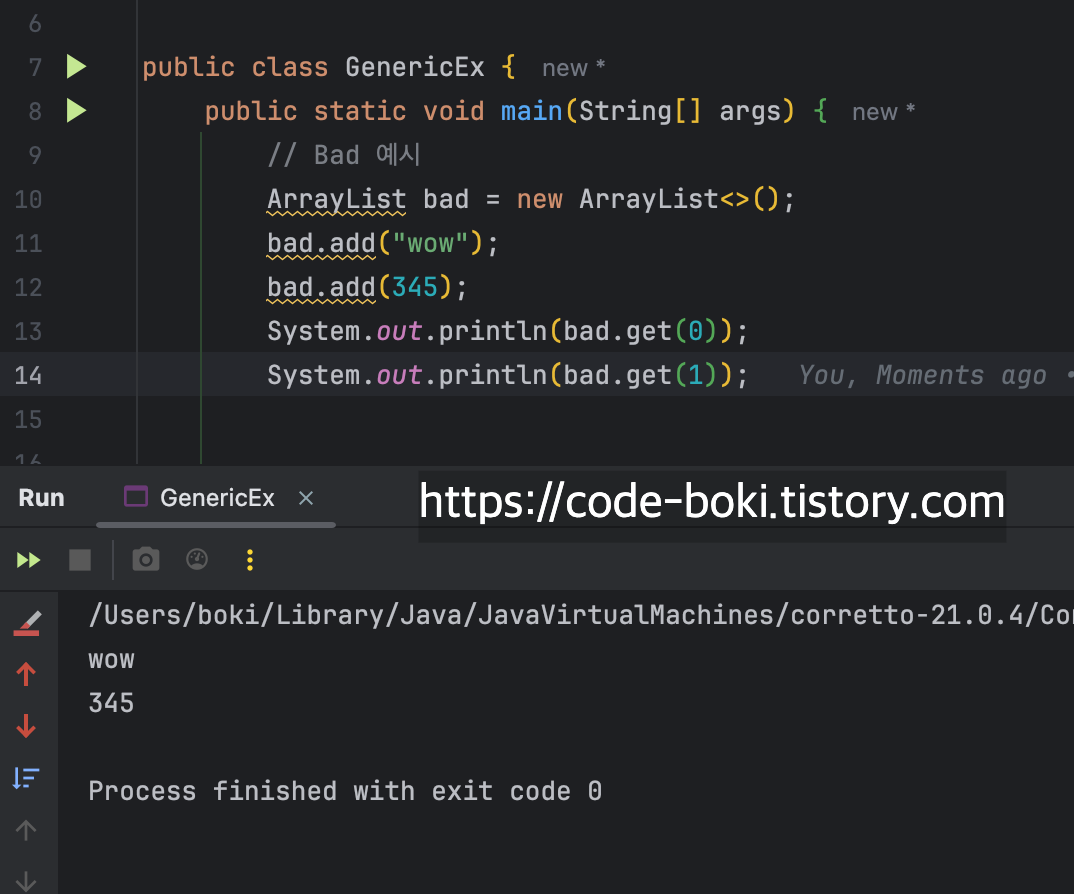 해석하면 너 지금 ArrayList를 날것으로 쓰고 있어. 그러니 generic을 추가해보지 않으련? 라고 말하고 있다