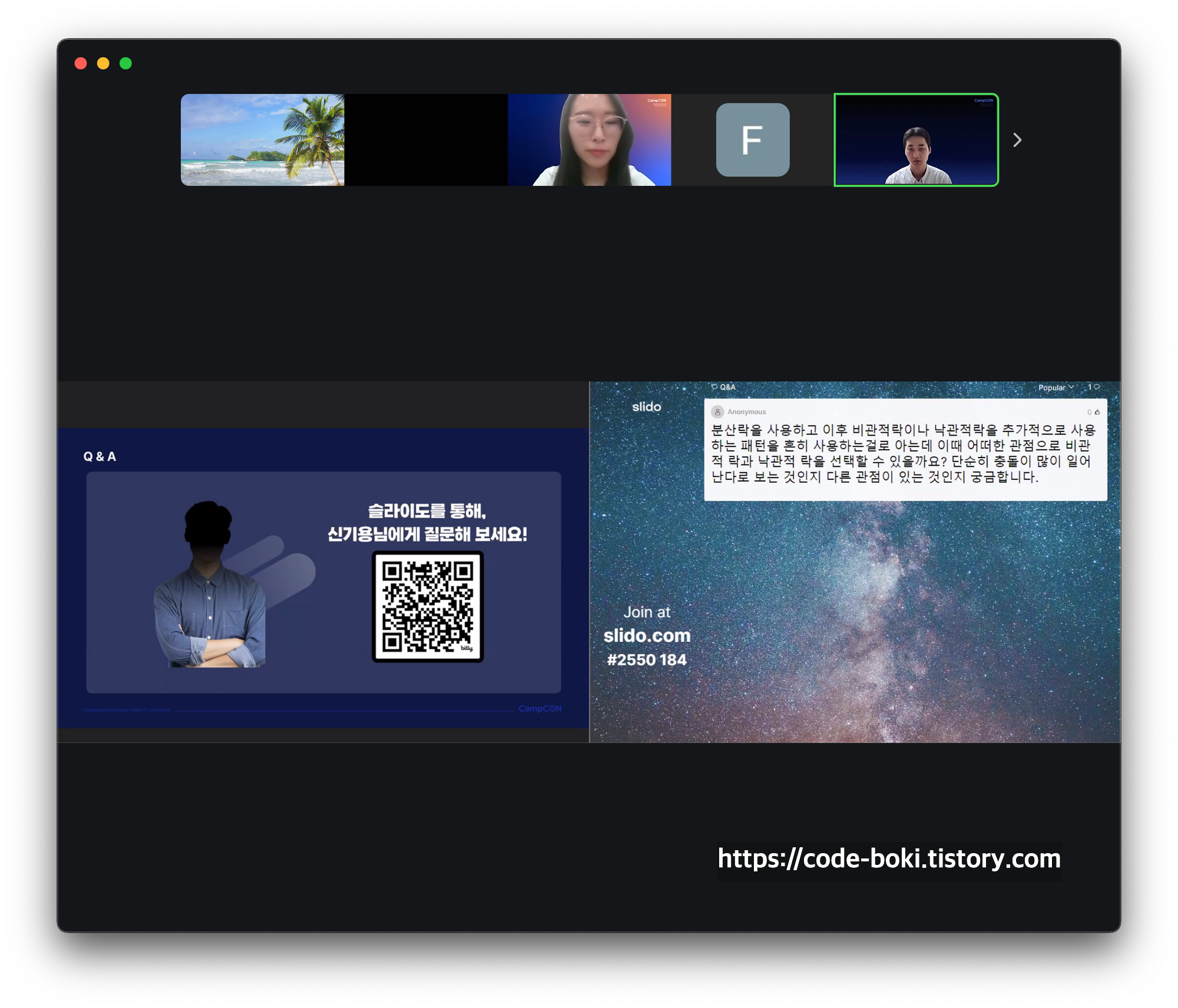 보통 다른 행사에서는 발표에 시간을 다 소모해서 Q&A에서 2~3개만 받고 넘어가는데 비해 하은님이 열심히 답변해주시고, 패캠에 주어진 시간이 많았었나보다. 질문을 한 15개정도? 내 기억으로는 꽤 많이 답변을 해주신 것 같았다