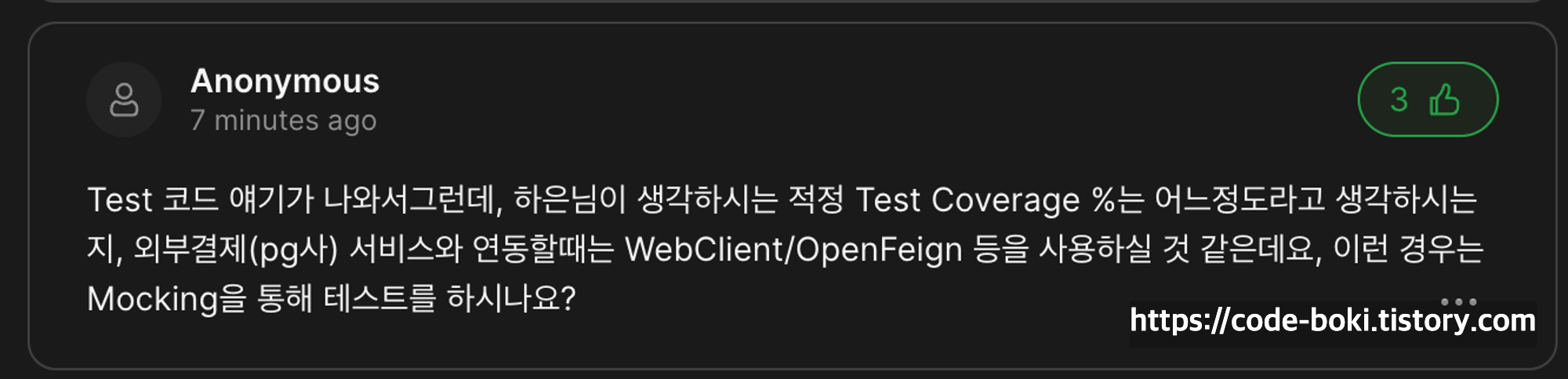 너무 당연한 질문이라 그런가....ㅎ 하은님이 생각하는 적정한 테스트 커버리지의 수치에 대해서 들을 수 있었고, 뒤에는 당연히 모킹한다. 네. 라고 하셨다..ㅎㅎ