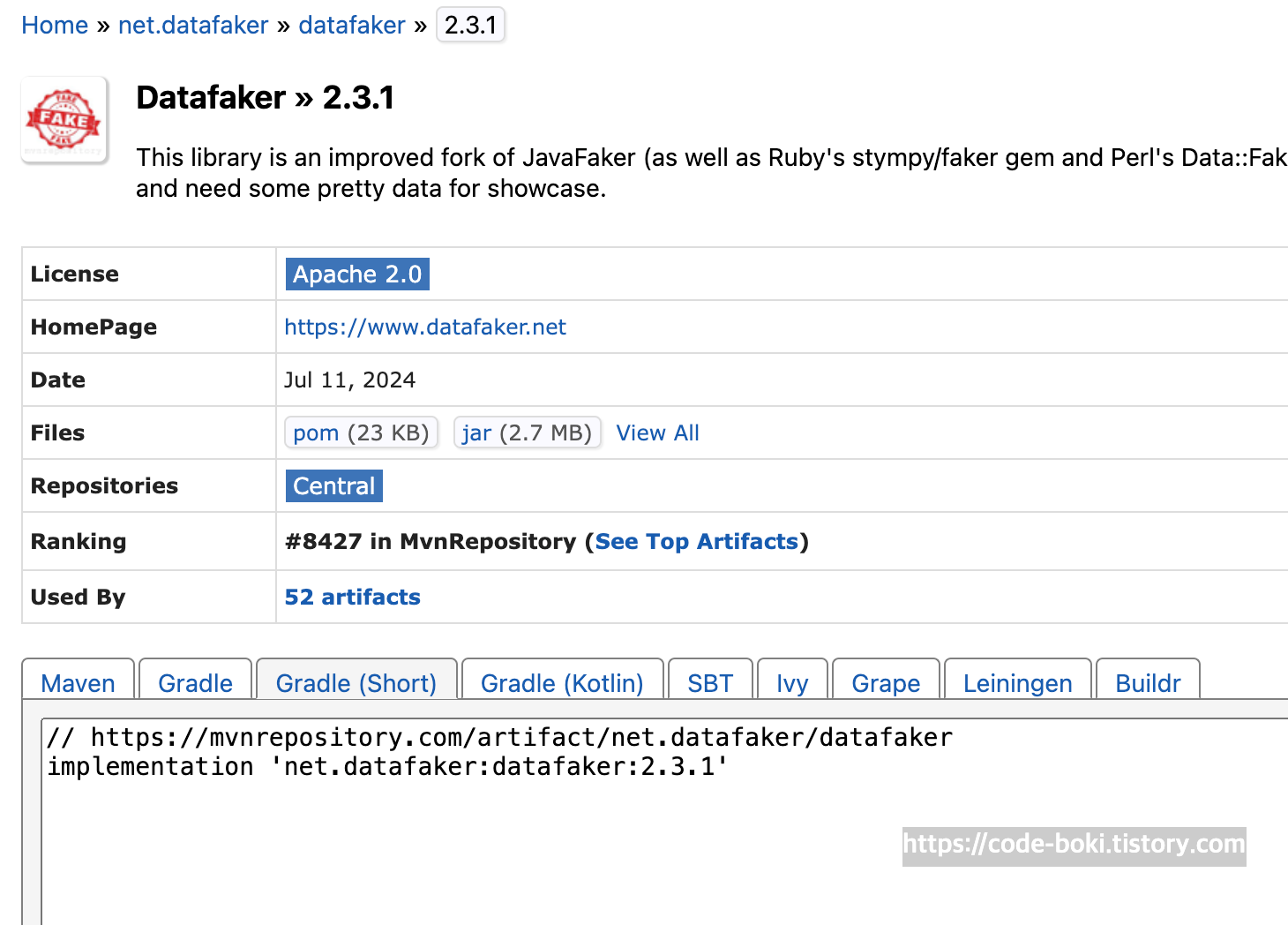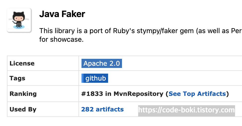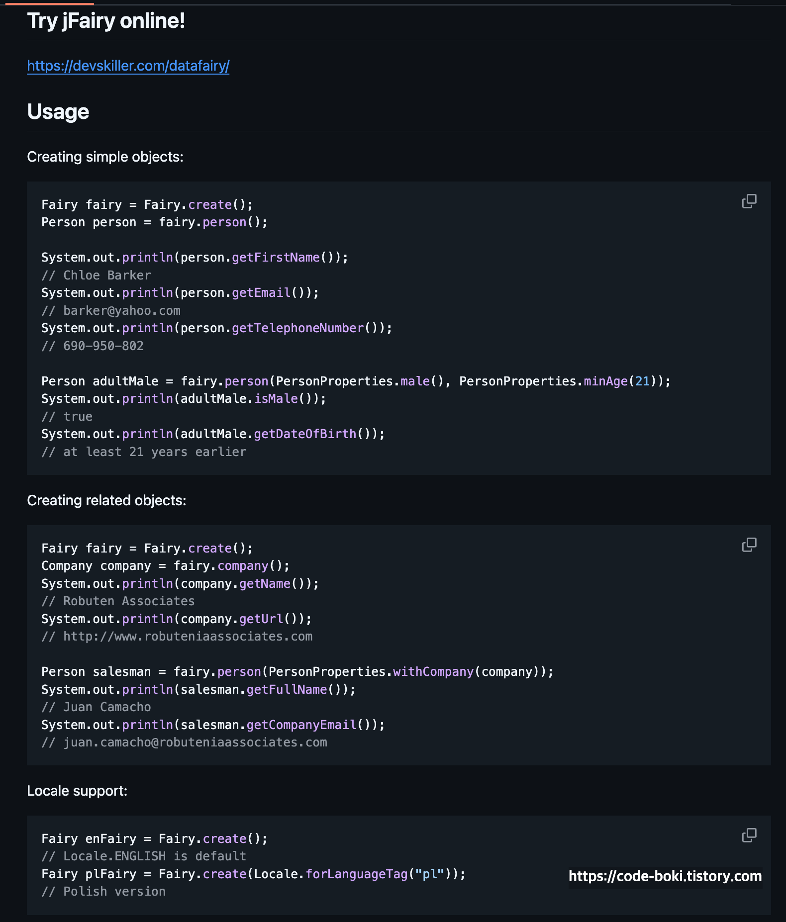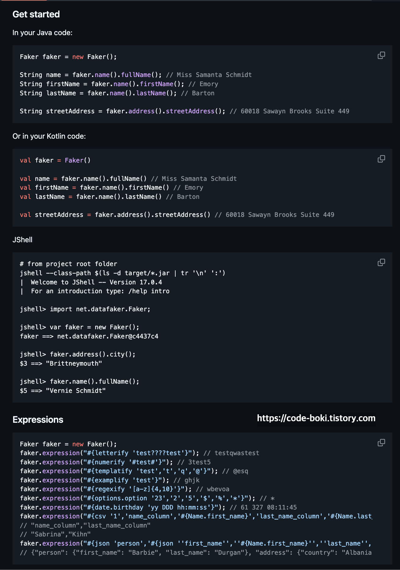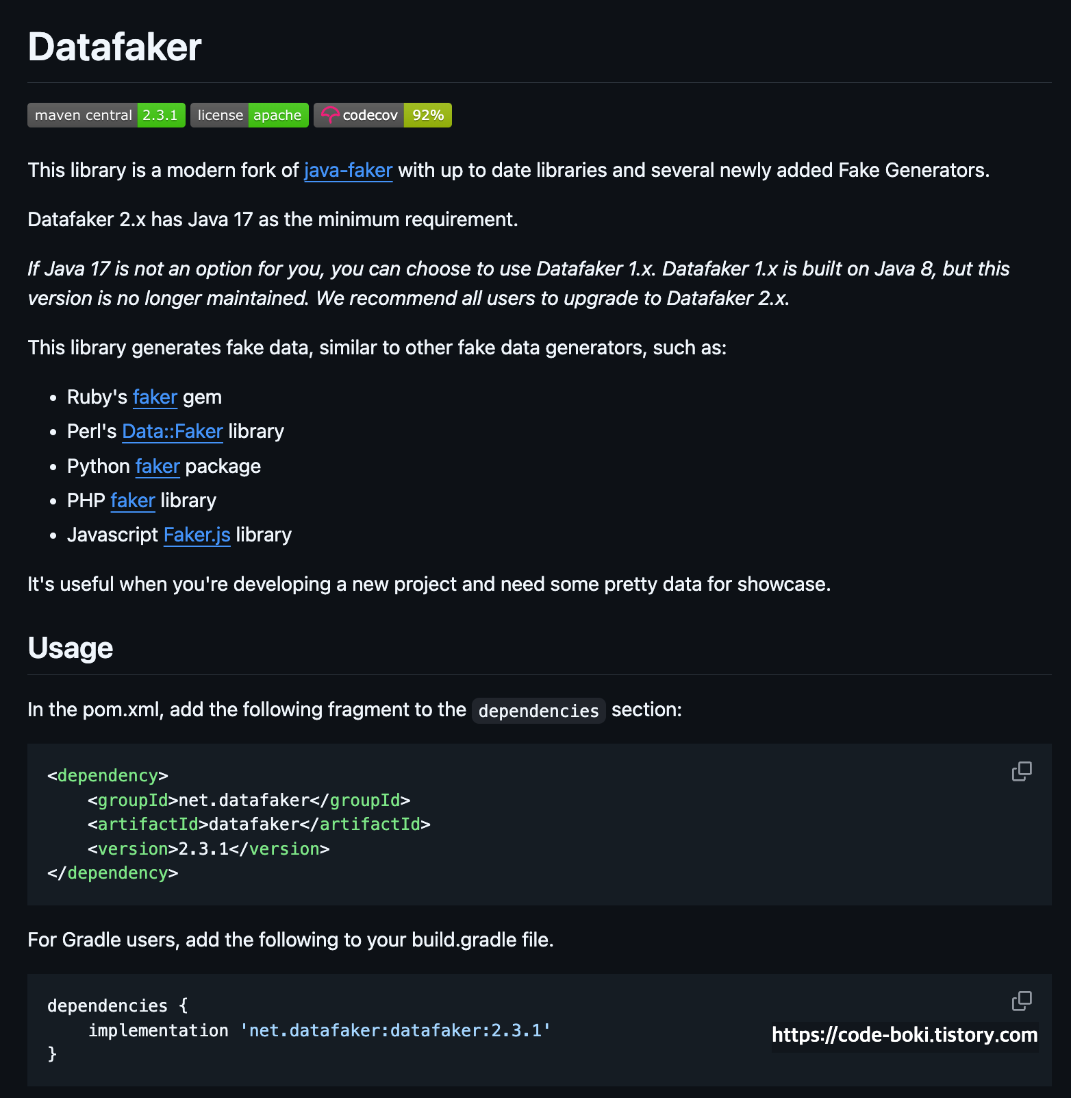 설명을 보면 JavaFaker로부터 fork를 하여서 향상시킨 라이브러리라고 소개하고 있다