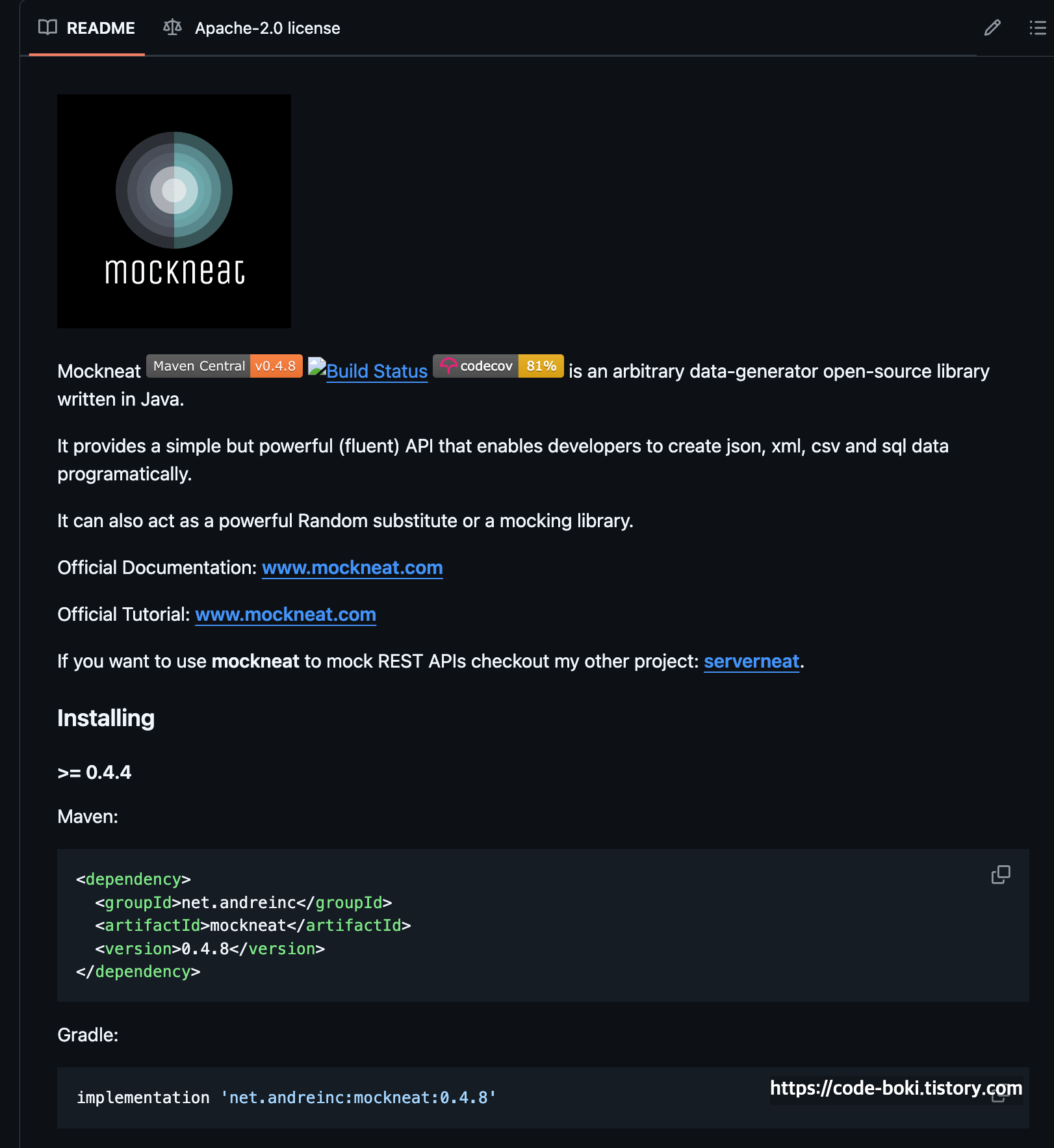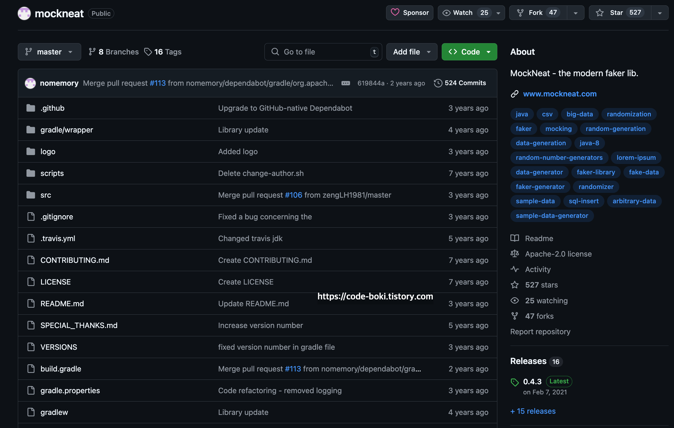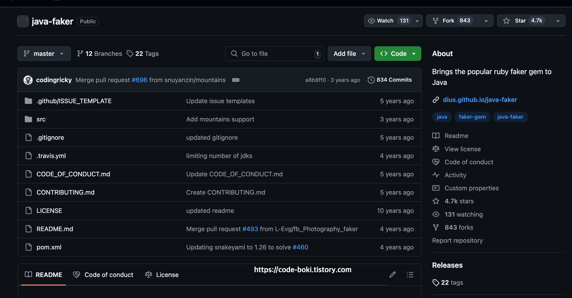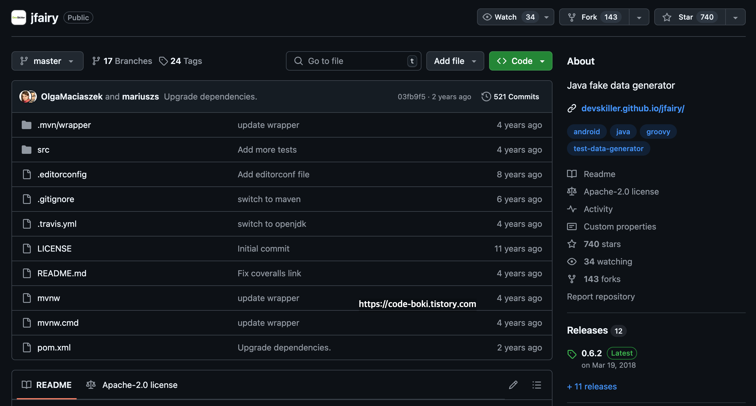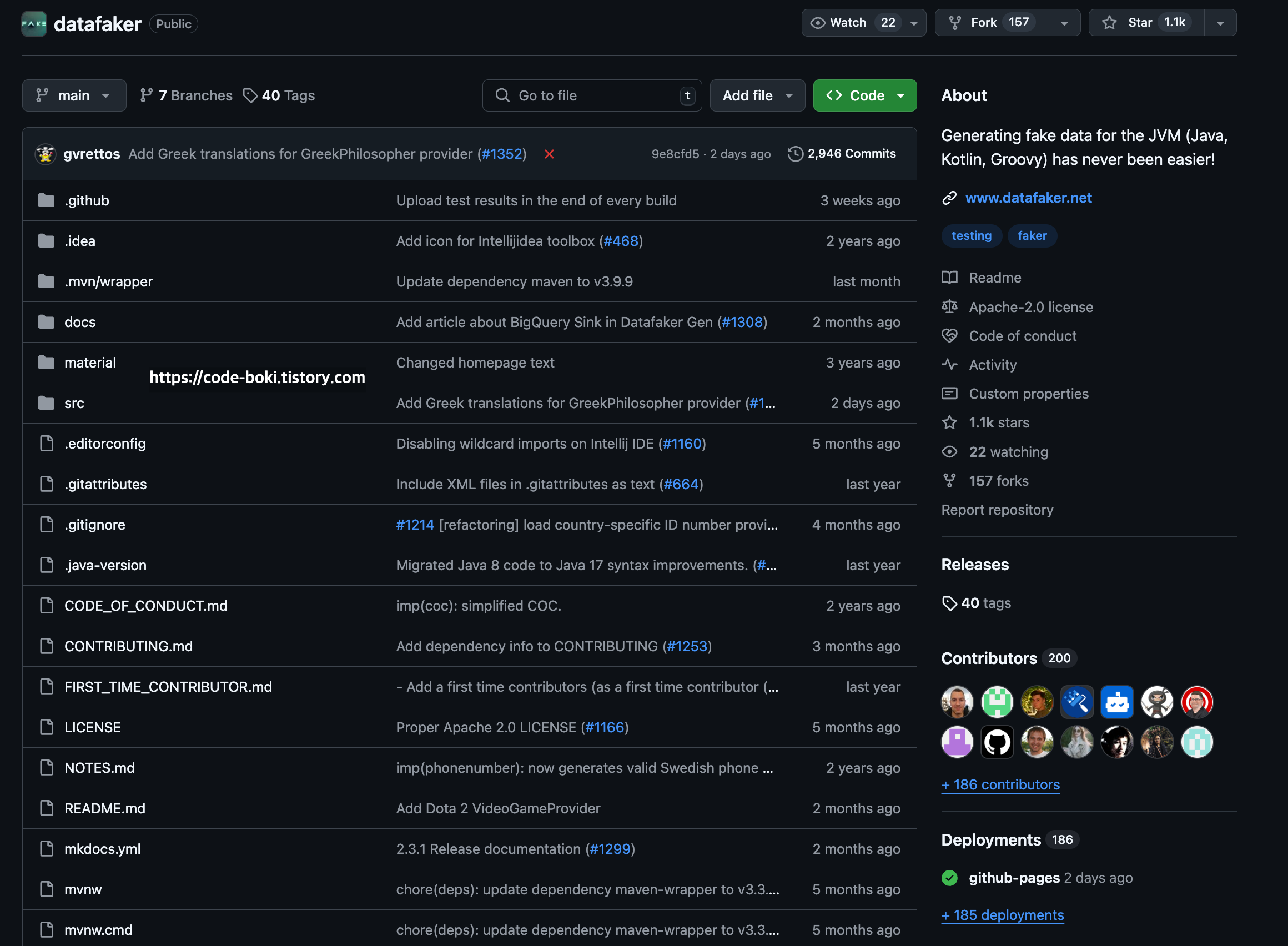 설명을 보면 JavaFaker로부터 fork를 하여서 향상시킨 라이브러리라고 소개하고 있다
