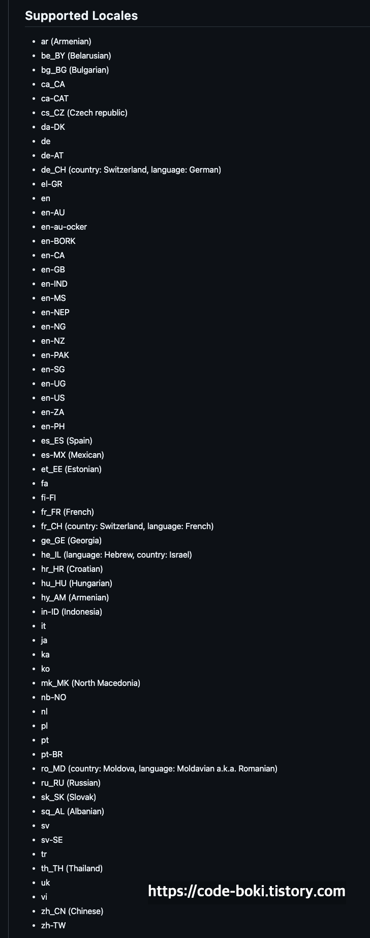 추가로 Locale도 지원하는것 같았지만 몇 개 국가를 지원하는지는 정확히 깃허브 공식문서에서는 나와있지 않았다