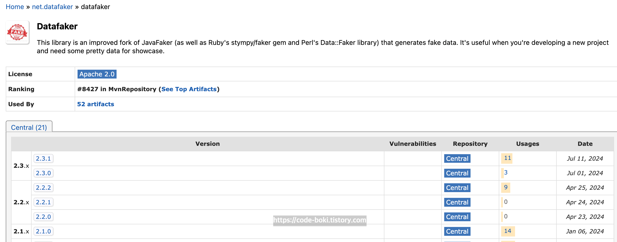 1. https://mvnrepository.com/artifact/net.datafaker/datafaker