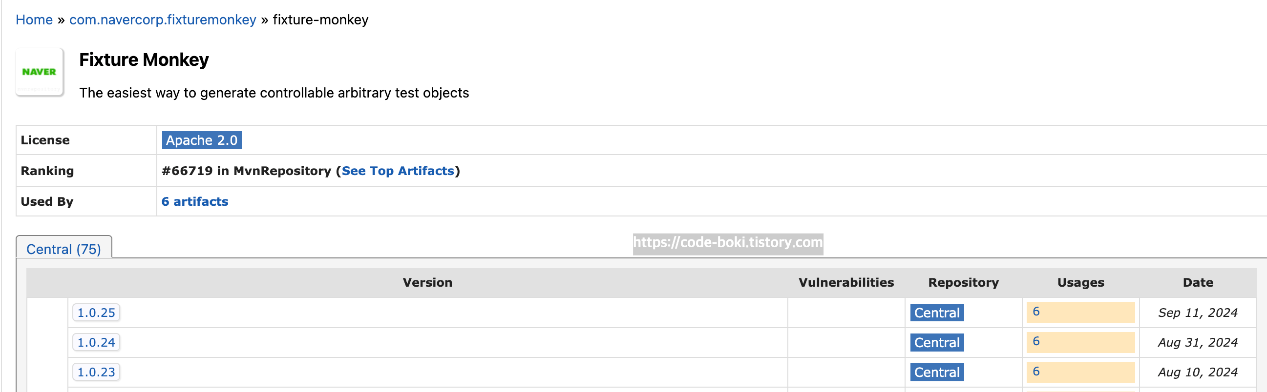 1. https://mvnrepository.com/artifact/com.navercorp.fixturemonkey/fixture-monkey