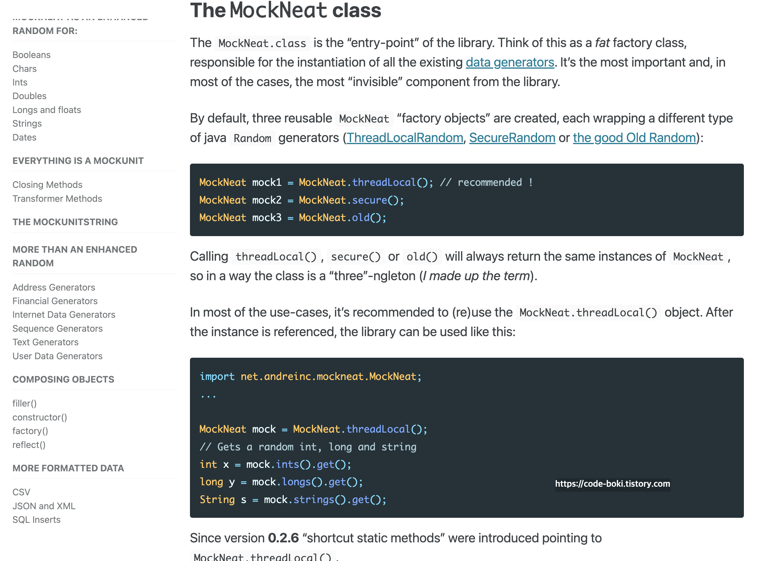 jFairy는 공식문서라기보다 그냥 우리꺼로 만들면 이렇게 되는거 보여줄게요~하는 홈페이지 느낌이었다면 mockneat는 진짜로 공식문서 페이지가 존재한다