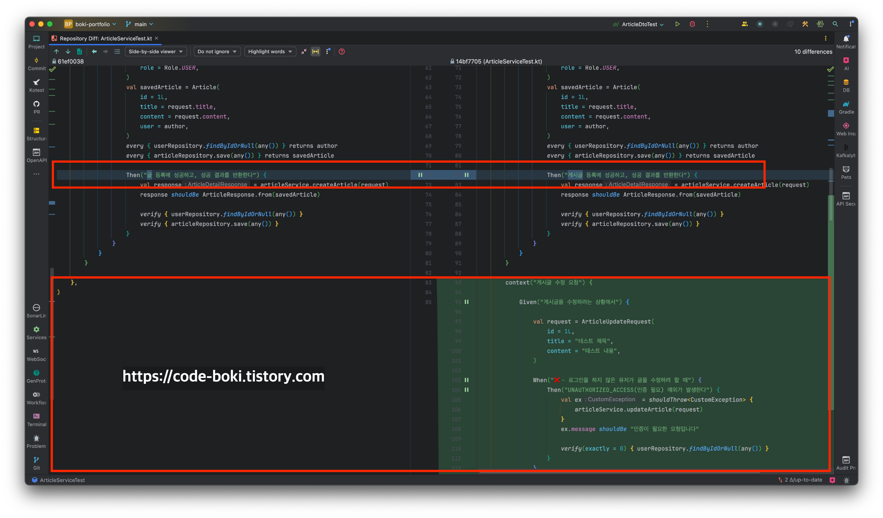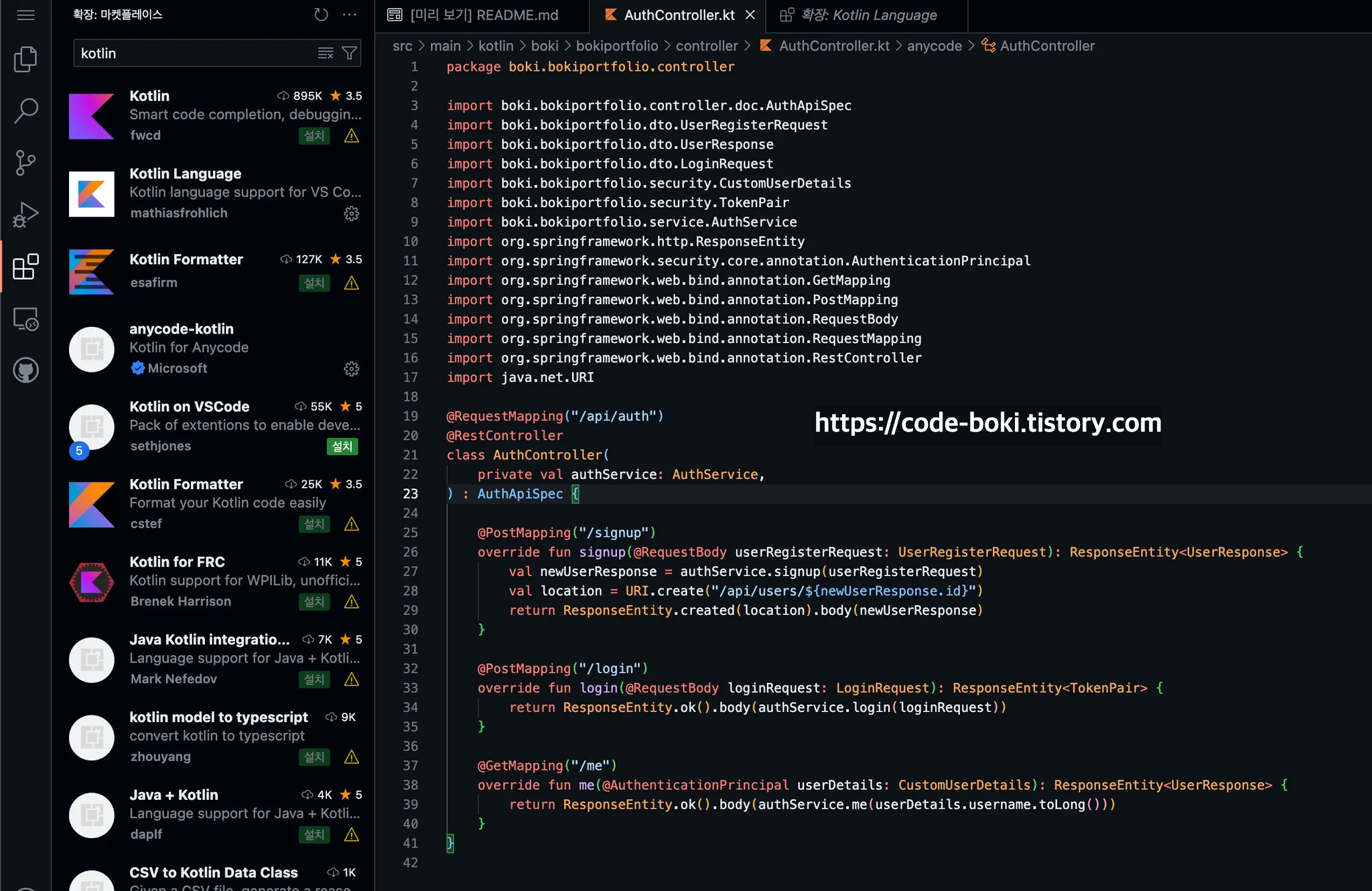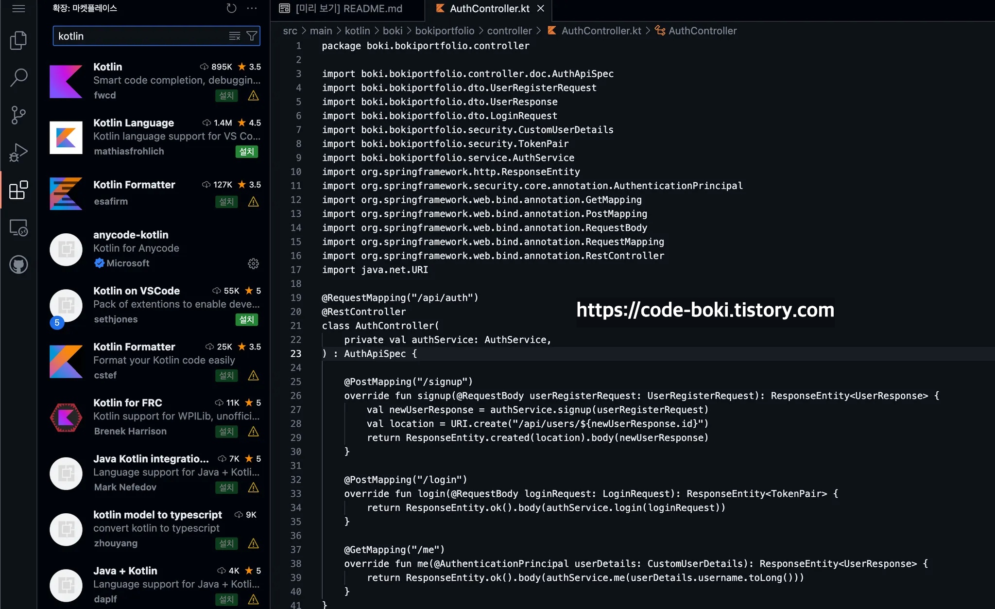 참고로 코틀린 코드도 볼 수 있는데, extension을 설치하면 색상이 나온다(색상이 별거아닌거같아 보이지만, 하얀색 텍스트보다 보기 좋다)