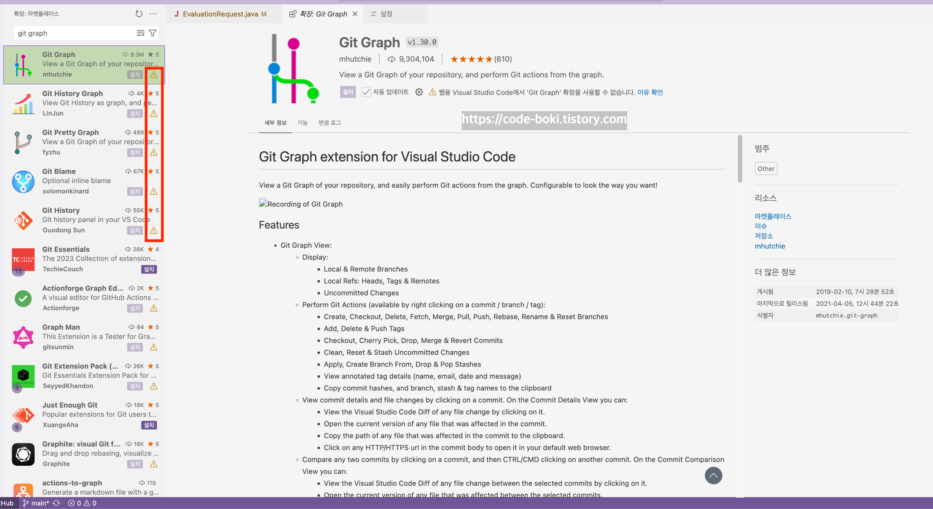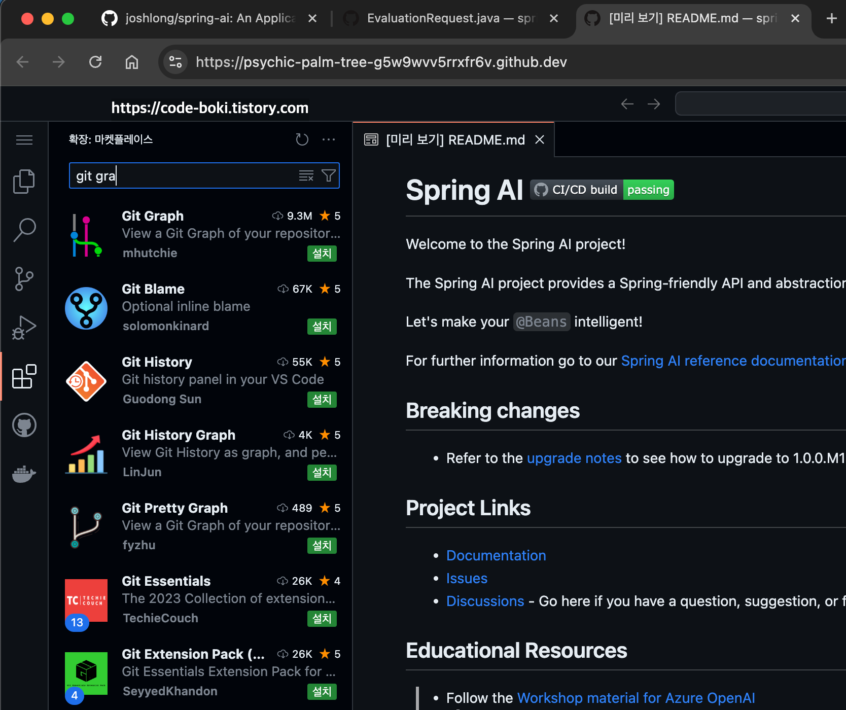 여기서는 git graph를 설치하고 사용할 수 있는 모습..