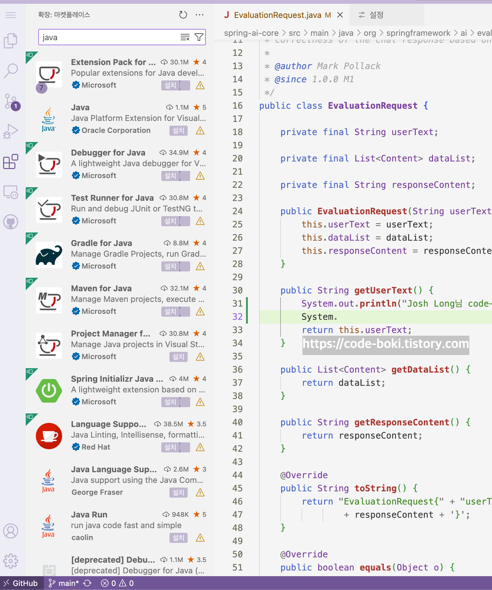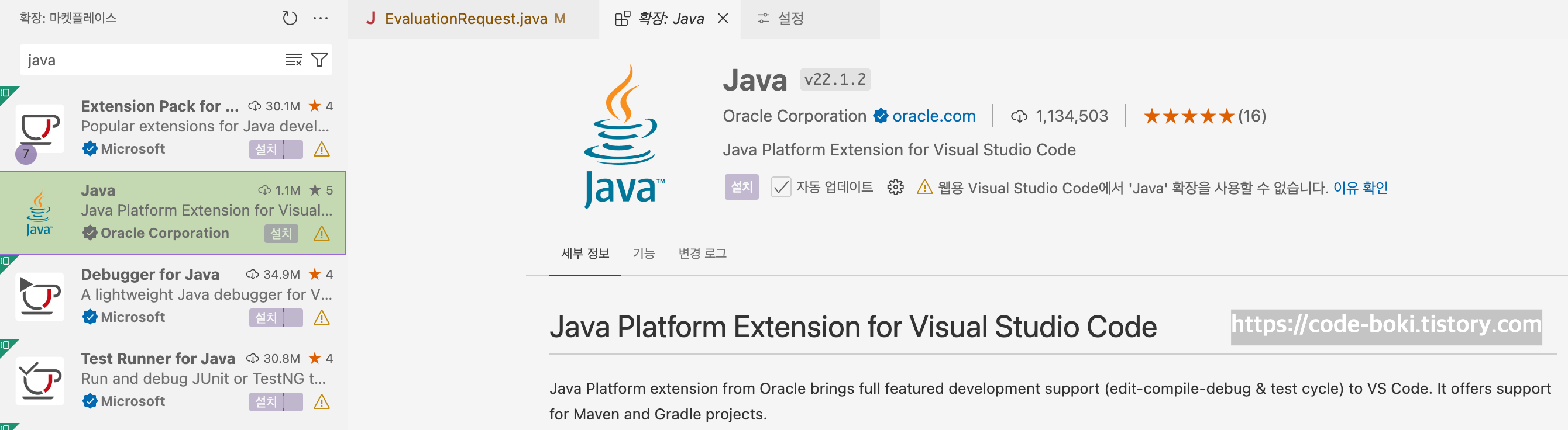 그럼 Java관련 Extension을 설치해서 도움을 받아볼까..?