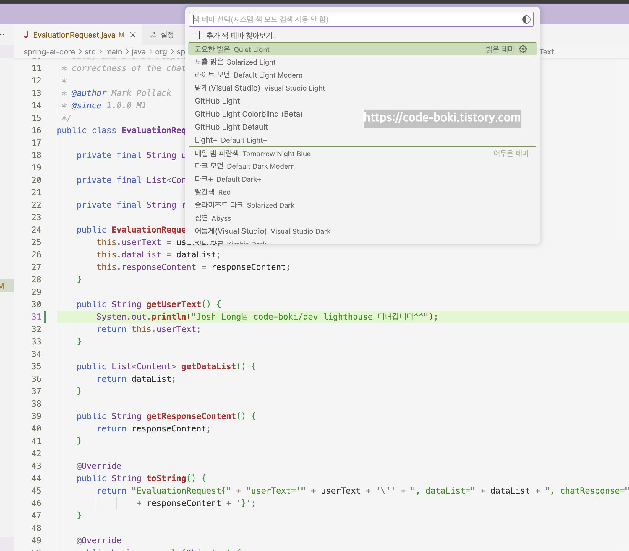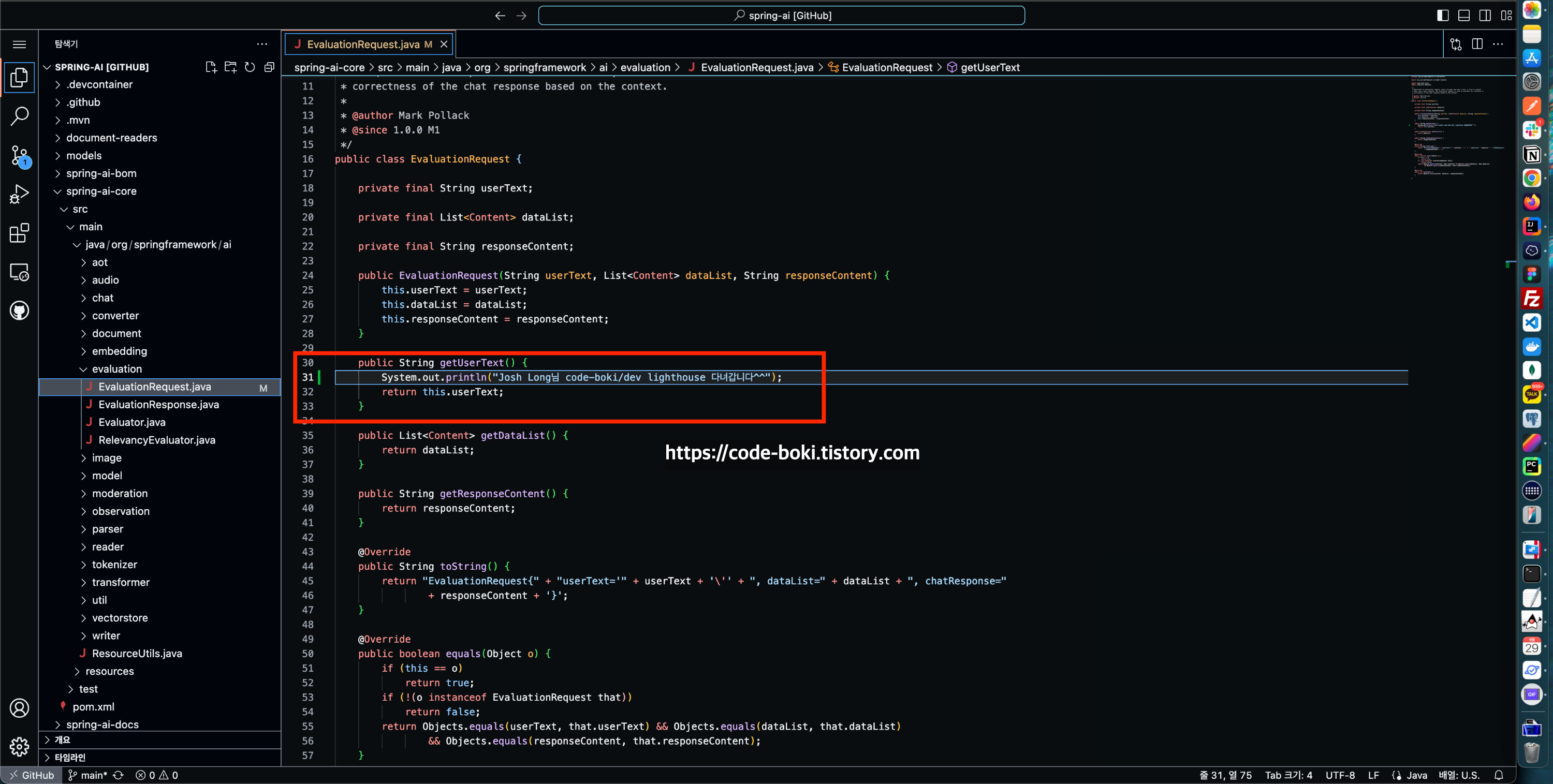 나는 spring-ai-core의 src/main/.../EvaluationRequest.java 파일을 열었다