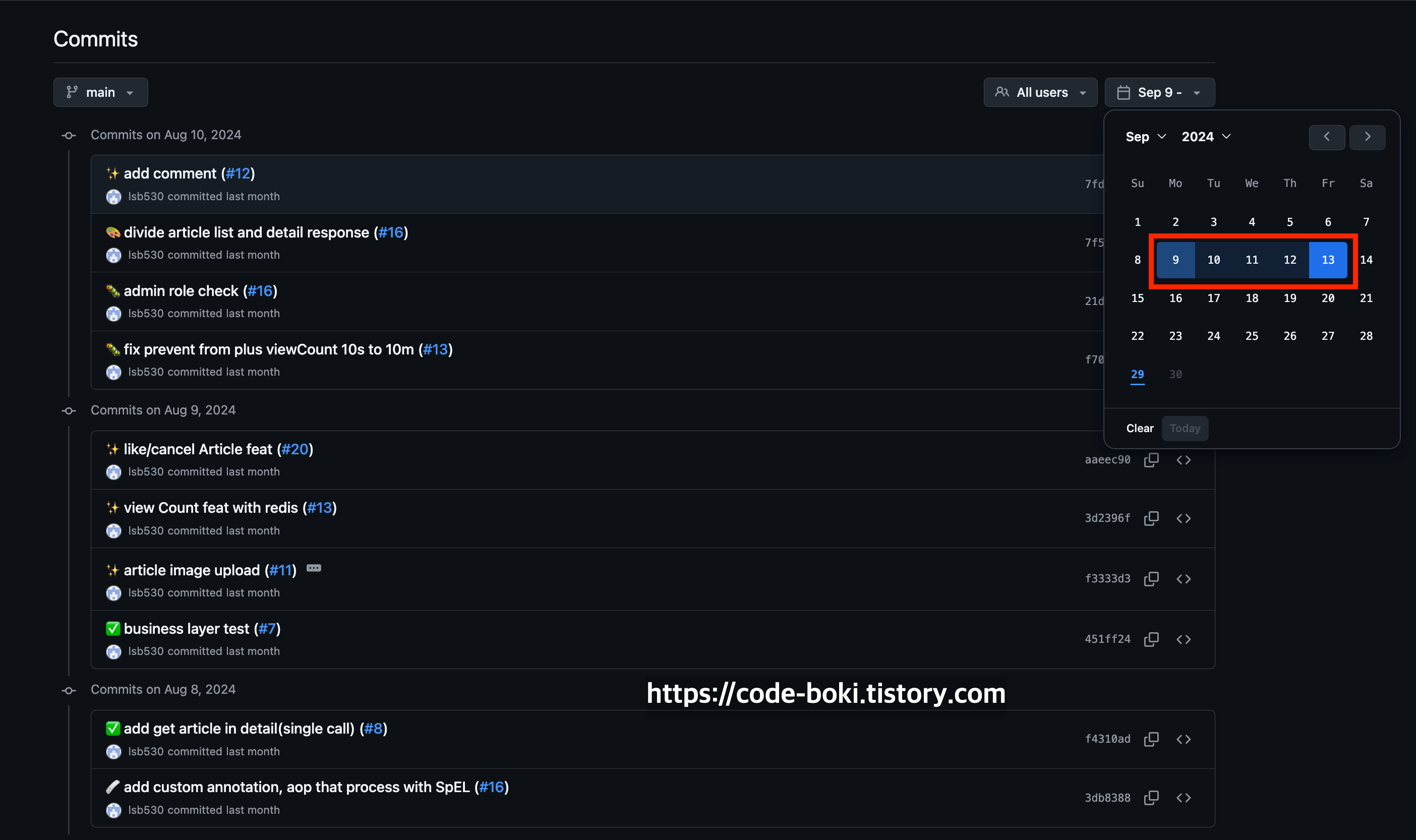 2번) gitlab이나 github의 commits 클릭하고 날짜 Range를 선택 후(datepicker) 해당 기간(ex:1주일)의 커밋들을 모아서 어느 부분이 삭제됐고, 추가됐는지에 대한 논의를 나눠요