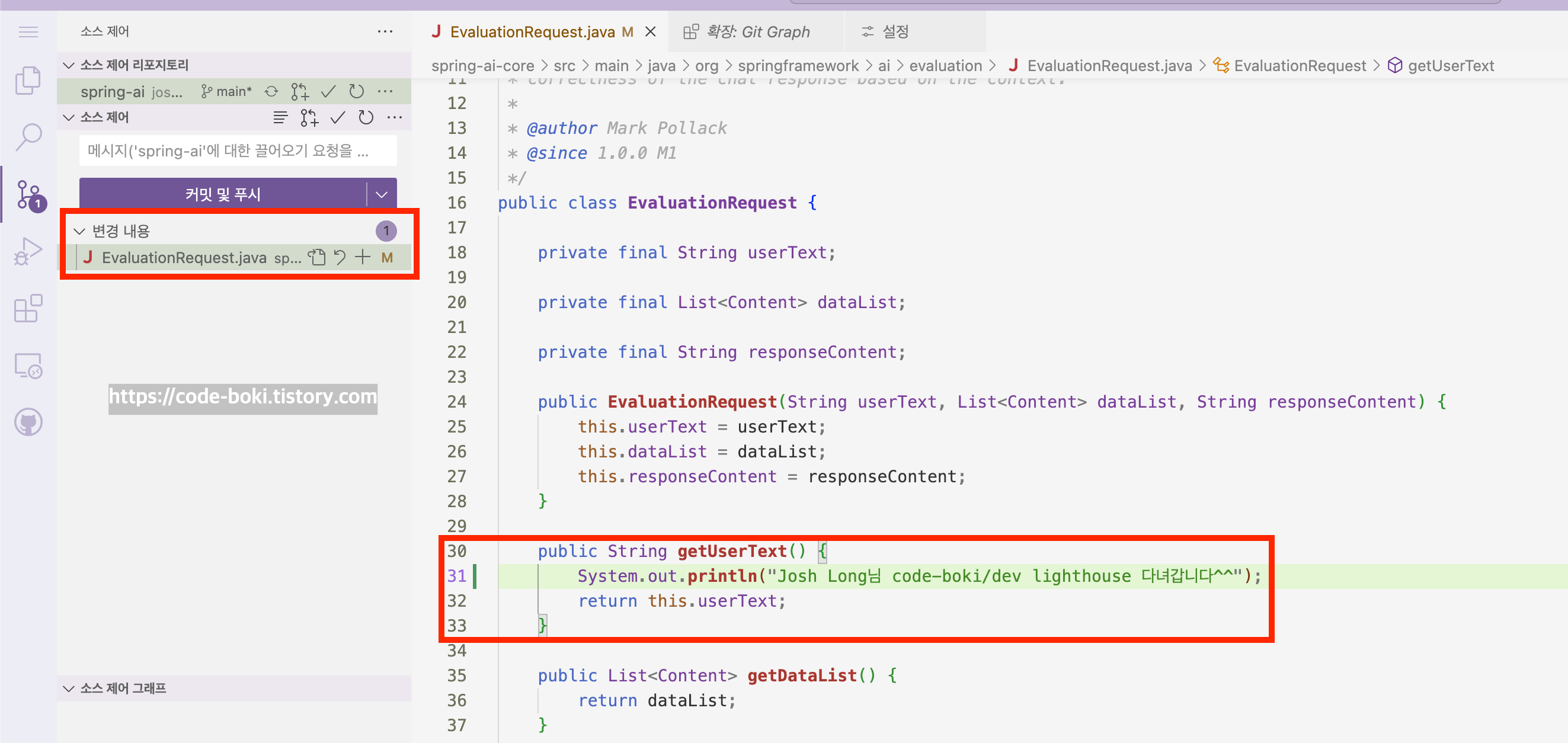 나는 spring-ai-core의 src/main/.../EvaluationRequest.java 파일을 열었다