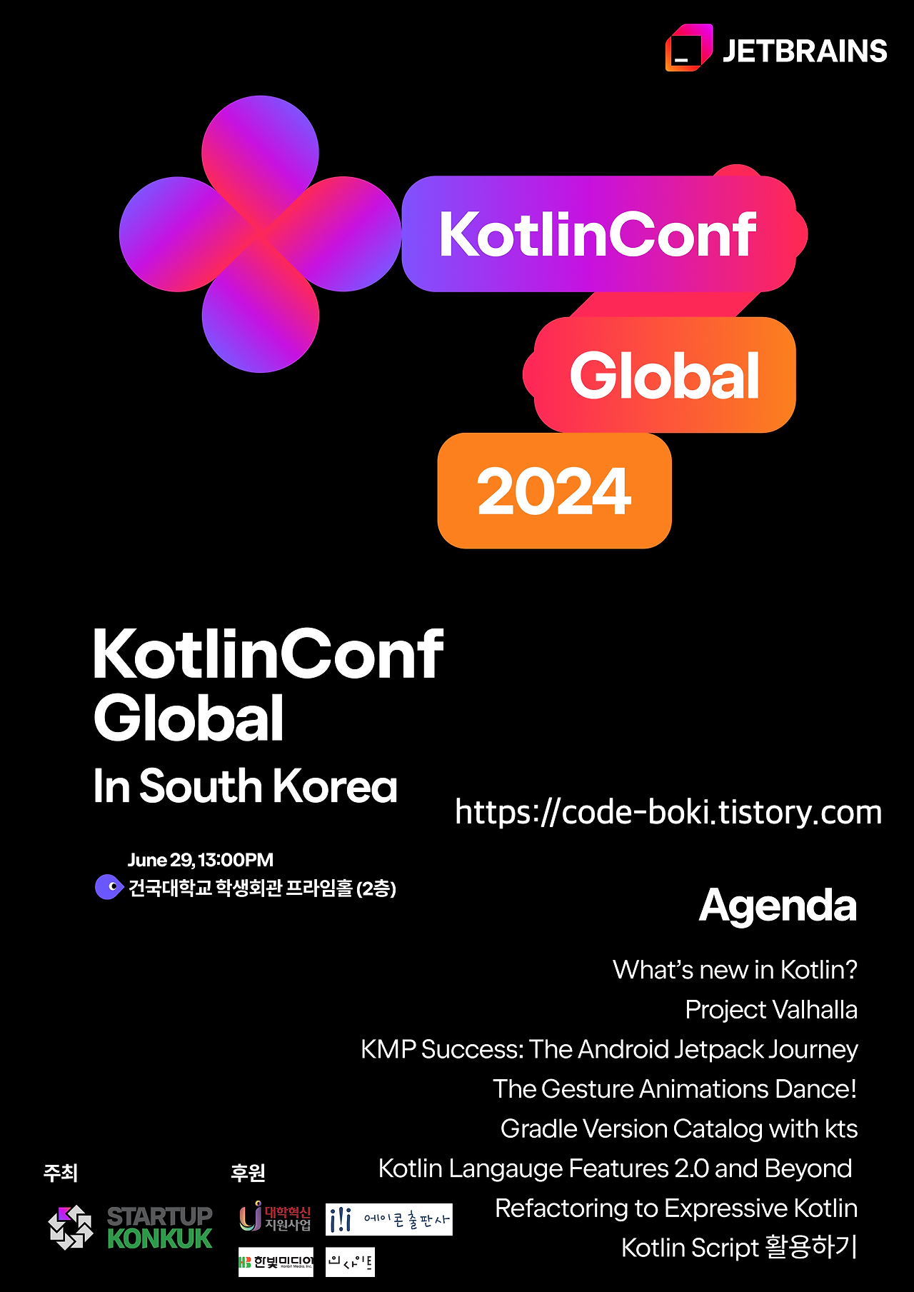 글로벌 KotlinConf 2024https://kotlinconf.com/ KotlinConf 2024 | KotlinConf 2024, May 22–24, CopenhagenKotlinConf 2024 was a great success thanks to 102 valued speakers presenting 77 sessions and 6 workshops, 2000 attendees from all over the world, 19