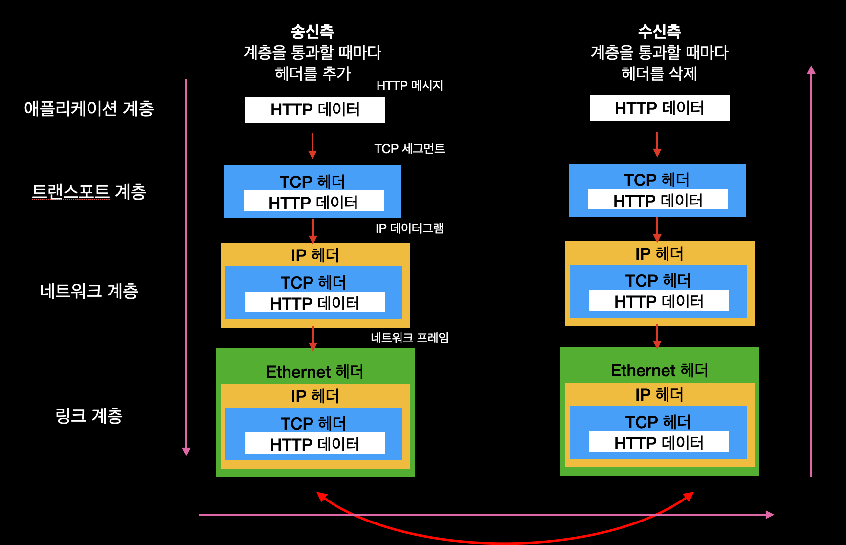 각 계층을 거칠 때는 반드시 헤더로 불려지는 해당 계층마다 해당 계층에 필요한 정보를 추가합니다. 반대로 수신측에서는 각 계층을 거칠 때마다 반드시 해당 계층마다 사용한 헤더를 삭제합니다.