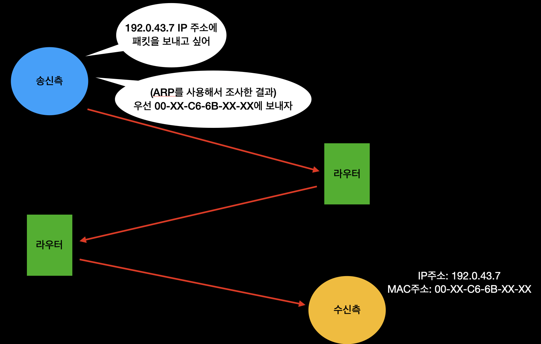 IP 통신은 MAC 주소에 의존해서 통신을 합니다. 중계하는 동안에는 다음으로 중계할 곳의 MAC 주소를 사용하여 목적지를 찾아가는 것입니다. 이때, ARP(Address Resolution Protocol)이라는 프로토콜이 사용됩니다.