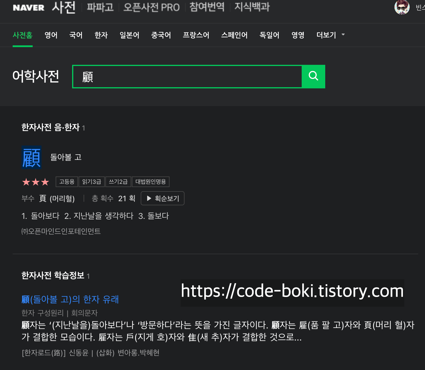 용어를 잘 살펴보면 回 + 顧로 구성된 것을 볼 수 있는데.. 각각 네이버 사전에서 검색해봤다