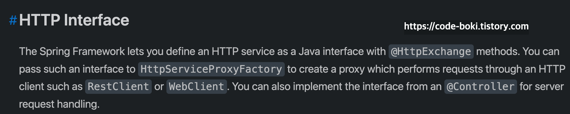 내용을 살펴보면 RestClient, WebClient, RestTemplate은 구현체인 모양새고, HTTP interface는 어노테이션 기반의 인터페이스이고 동적 프록시 구현체가 사용된다고 나와있다