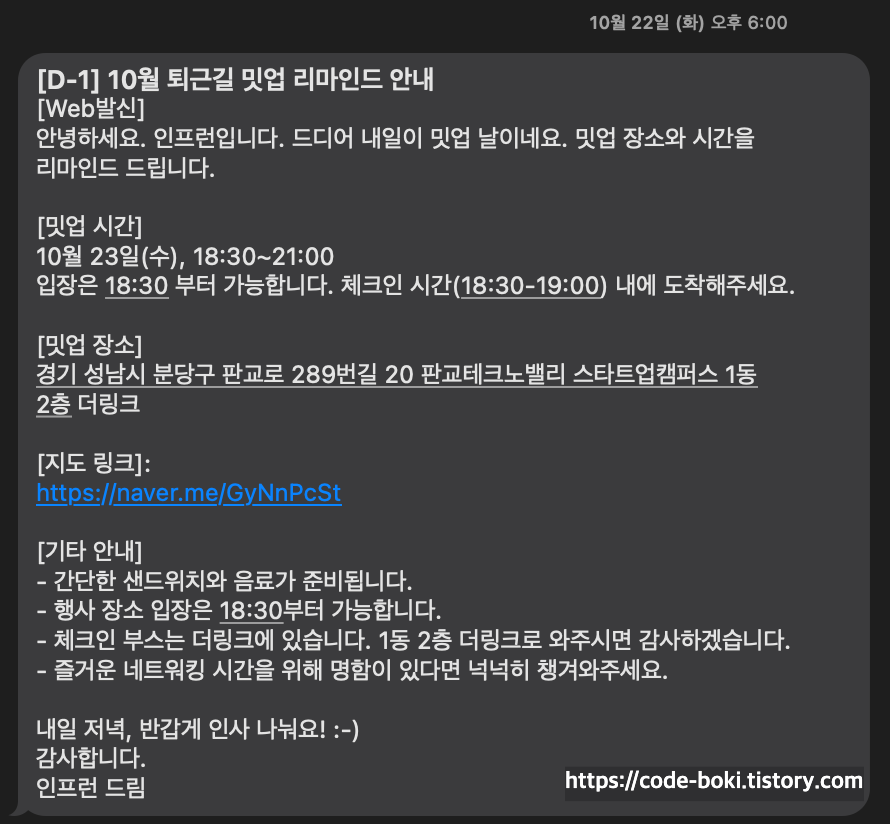 인프런과 함께 같이 성장을 도모하는 분들에게 제공되는 인프런 라운지의 혜택에서 추첨을 통해 당첨되어서 판교 퇴근길 밋업 행사에 참여할 수 있게 됐다