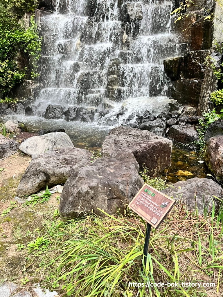 1층으로 내려와서 식당이 보이는 바깥쪽으로 돌다보면 산책할 수 있는 공간도 보이고 이런 이쁜 폭포도 구경할 수 있었다