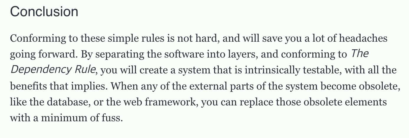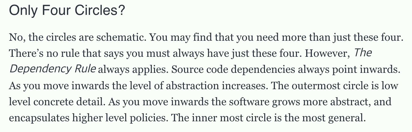 하지만, 의존성 규칙은 항상 적용되어야 한다고 한다. 소스코드 종속성은 항상 안쪽으로 향해야 한다. 안쪽으로 이동할수록 추상화 수준이 높아지고, 바깥쪽으로 향할수록 더 구체적인 수준이다