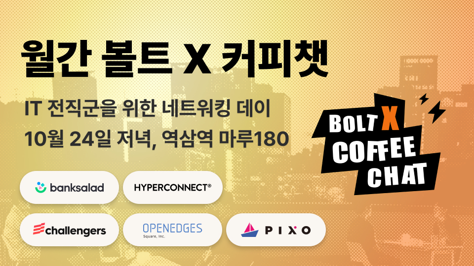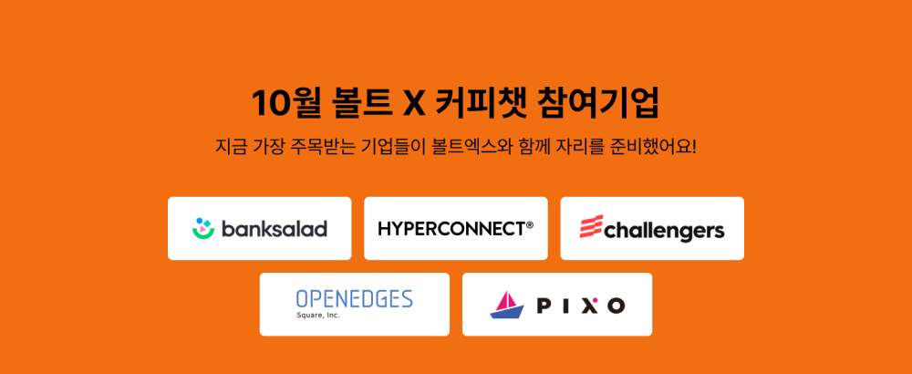 10월 볼트 X 월간커피챗 : 뱅크샐러드, 하이퍼커넥트, 챌린저스, 오픈엣지스퀘어, 픽소와 함께해요