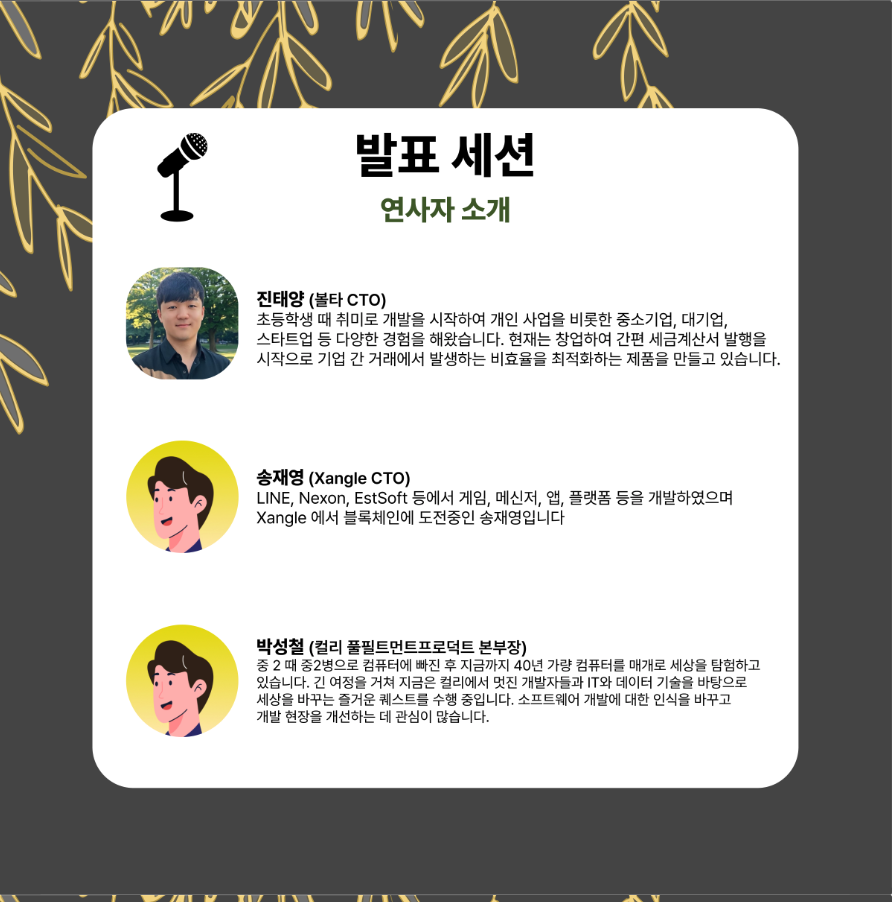 발표세션으로 볼타 CTO 진태양님, Xangle CTO 송재영님, 컬리 풀필먼트프로덕트 본부장님 박성철님이 마이크를 잡아주셨다